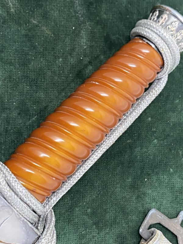This is an extremely nice army officers dagger with the WMW WAFFEN maker stamped into the blade. This is the mark for Max Weyersberg. Deep orange grip which has deepened over the years, as the reverse has a much lighter colour. The whole dagger has a very heavy silver content plating, which is completely intact. So much so thst where the crossguard has covered and protected the top of the scabbard, it’s left a much lighter silhouette of the eagle etc outlined on the unexposed surface. Very neat! Max Weyersberg used the ‘type 2’ dagger crossguard which closely resembles the one used by WKC. It has a perfect original 42cm bullion portapee tied in place and a very nice set of de-luxe dagger hangers, which have been period shortened by the original owner by turning over an inch of each strap and sewing it in place! The blade is in mint condition and has the WMW WAFFEN lettering stamped into the reverse riccasso.