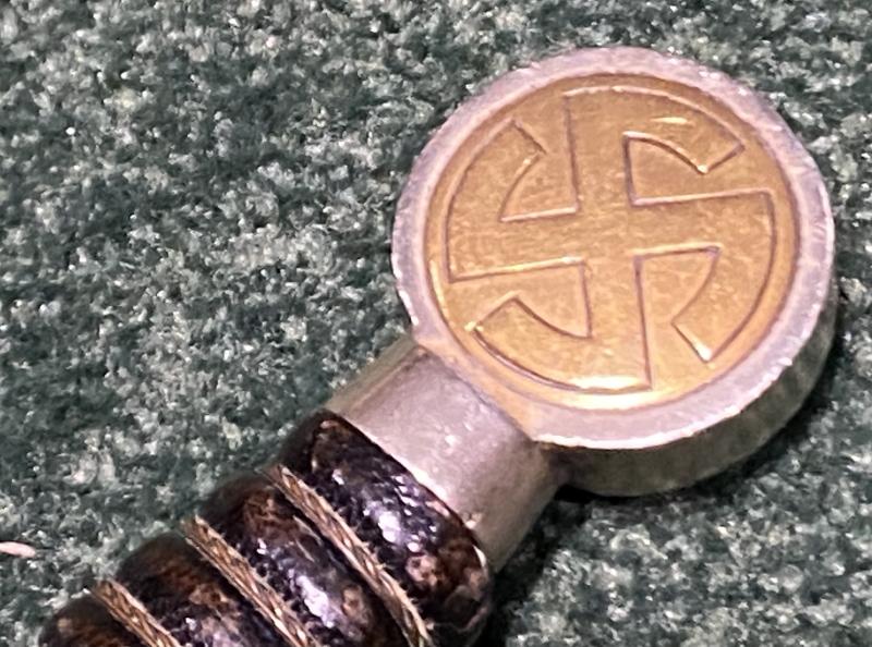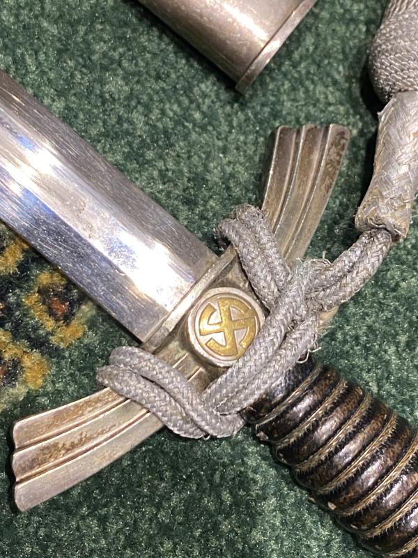 A classic early Luftwaffe dagger. All nickel construction with very nice scabbard and grip leather. This 1st type Luftwaffe dagger was introduced in 1935 and was worn by all serving Luftwaffe OFFICERS only. It was was replaced by the 2nd Pattn Luftwaffe dagger introduced in 1937. The original 1st type continued to be worn by senior NCO's but not in nickel. This is a lovely example and has remained untouched and uncleaned. Heavy silver content in the nickel fittings. Near perfect blue Moroccan leather to the grip and scabbard. Solid nickel chains with a DRGM marked snap clip. There is an original 23cm portapee tied around the grip and crossguard, which again looks to have been with the dagger for a long time. The heavily nickel plated blade is in mint condition throughout and is etched with the oval Weyersbery trademark and a little Waffanampt 'stick bird' inspection mark above it.