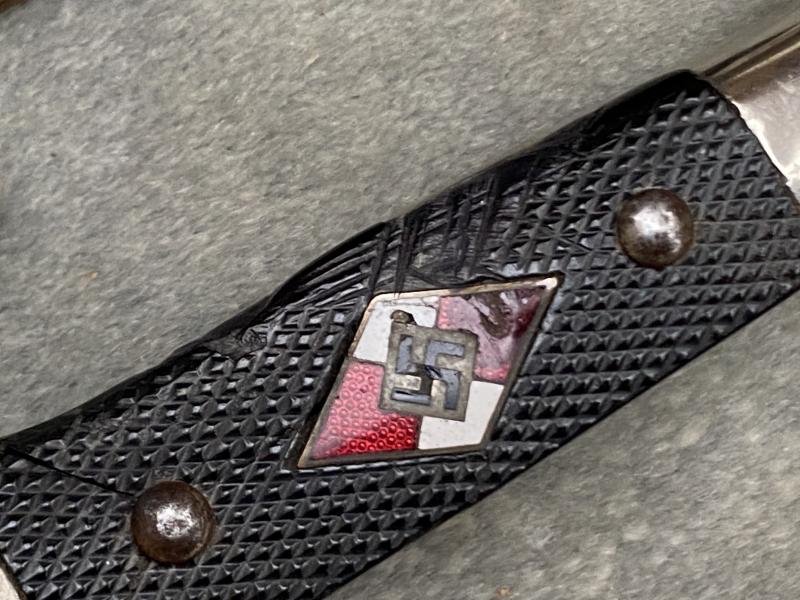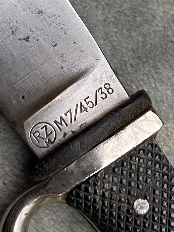 Whist HJ daggers ceased to have the Blut und Ehre motto on the blade during 1938. It was only from 1939 onwards that there are only plain blades. During the early part of 1938 mottos still appeared on blades. This is one with RZM M7/45/38 markings deeply stamped into the reverse riccasso. This RZM code is for Karl Boker a maker I’ve not come across before. Has all steel hilt etc, not the grey alloy for later ones. At some time the chequered grip on the obverse has received a hit and been repaired. The HJ diamond is a little bruised too in one red area. A very nice scabbard with original black paint and great belt leather and cross loop with popper. The blade has been used(as they should) but is in very good condition with very clear motto. Blade buffer intact. Priced with grip damage noted.