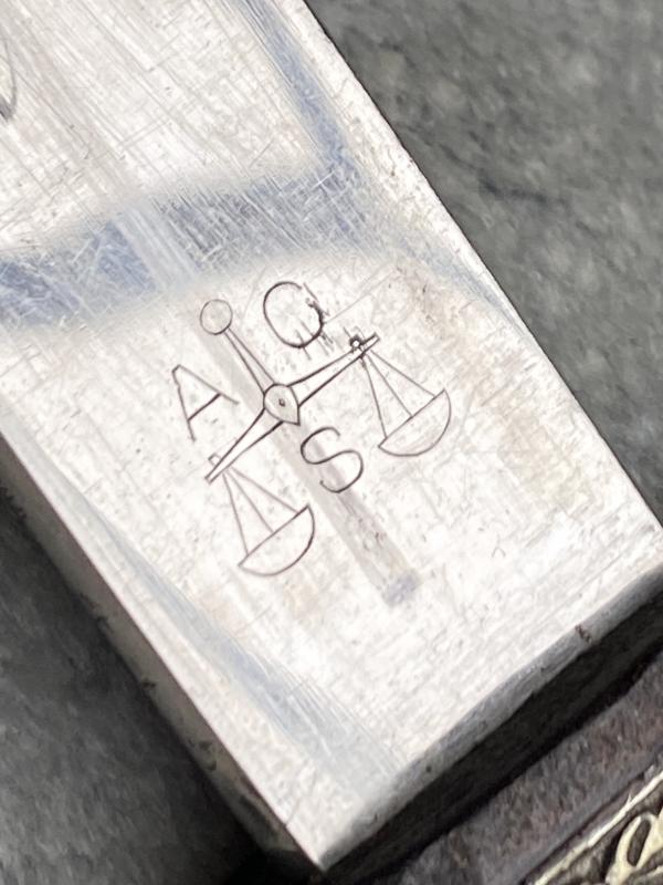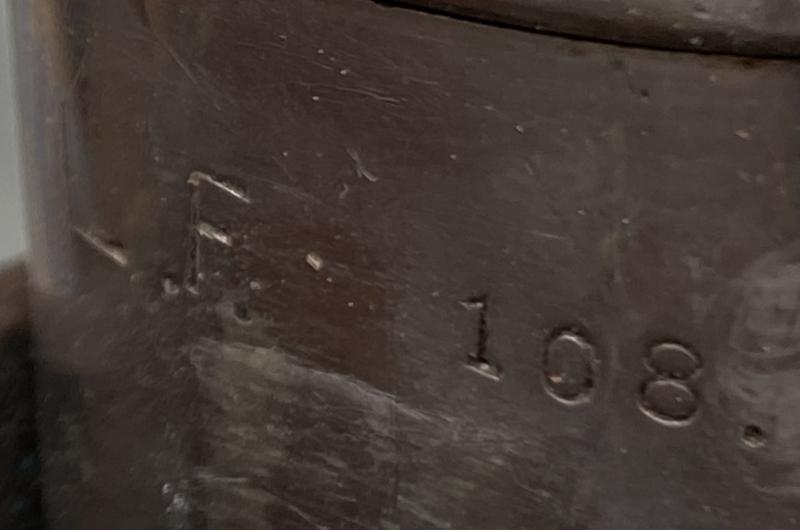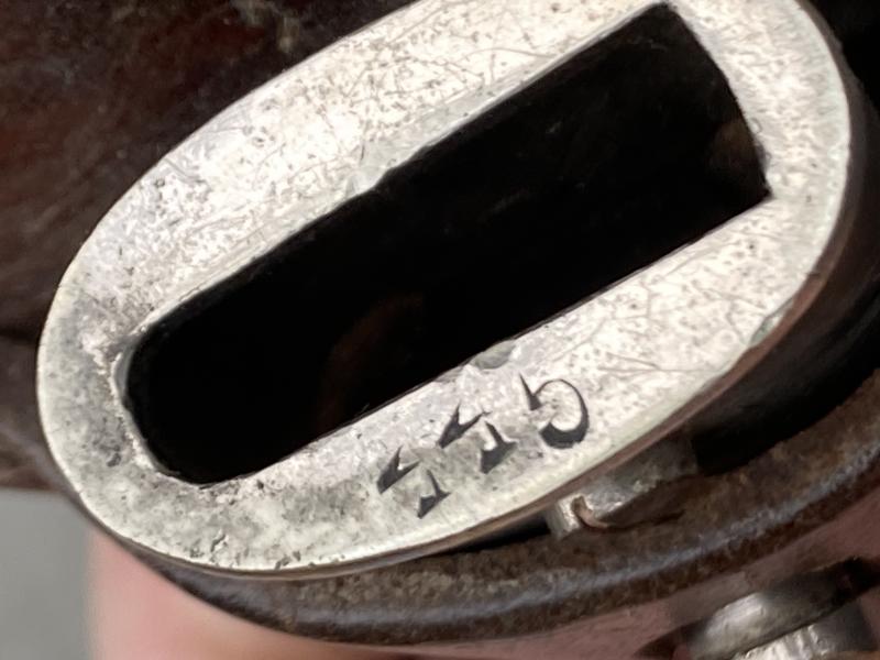 This is a really super example of a RURAL police parade bayonet. It has great tan brown scabbard leather and frog. These rural police bayonets are much more uncommon that the black leather TOWN/CITY bayonets. The country/rural Feldgendarmerie had brown backed uniform insignia and all the equipment, belt leather etc was brown too. Bayonet is a prime example of the standard cut-down Weimar police bayonet. You can see where the stag grip was shortened as well as the blade length. A very nice stag grip with aluminium oval police insignia. Reverse of crossguard is issue numbered and it has matching letters/numbers on the back of the scabbard throat.Looks like L.F. 108. It I also has 3 numbers stamped into the blade spine and also top of the scabbard throat. 445. So matching number TWICE just to be sure!!! A very nice brown police bayonet frog with aluminium reinforced rivets. The frog has a very nice large/wide portapee with very large acorn ball. This is actually a ‘grosse’ sword knot from a police officers sword. Not sure how it got on here but it looks very nice. A tan brown leather scabbard in perfect condition. All leather colour matches throughout. A mint nickel plated blade with double ALCOSO or Alexander Coppel makers marks.
