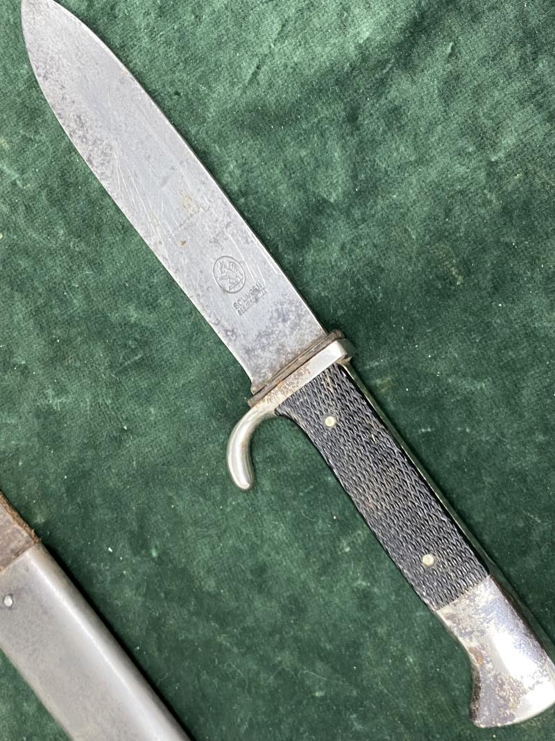 I have to admit in the 100’s of HJ knives I have handled, very early ones by Eickhorn do not appear! All steel hilt construction nickel plated. Chequered grip plates, which look to be ebony wood or Bakelite rather than celluloid, but I could be wrong. The blade has a full Blut und Ehre motto and NO blade riccasso, so thst really dates it. The Eickhorn trademark is one of their earliest from examples. A oval with a simple Eickhorn squirrel. Underneath Solingen and Ges.Gescutzt. Used from 1931-33!!! The very start of the HJ etc. Scabbard is straight with no damage. Has lost original black paint but retains the anodised finish underneath. Brown leather belt loop and cross strap with working popper. At some time, an attempt has been made to prise out the enamel HJ diamond and has chipped the grip plate around it. A really decent example right from the beginning.