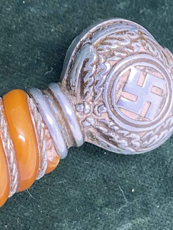 This is not a combination I have come across very often, especially on a Luftwaffe dagger like this. It was common for officers to acquire uniforms etc from an official distributor, a private taylor’s shop for instance. Daggers and swords could be ordered through them too, and very occasionally the distributor would add his name to the item, or in this case, stamp it onto the blade. This one has the name of GEBR. MEYER MUNSTER stamped on one side and the Eickhorn 1935-41 trademark etched on the other! It has a nice orange grip with twisted aluminium wire wrap. Two tiny period chips up beside the pommel neck. Original 23cm bullion portapee. Damage free dark finished scabbard with contrasting suspension bands. A decent set of de-luxe hangers which show honest period use. A very good dagger overall with interesting blade.