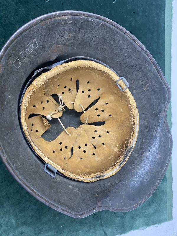 Stocks of Imperial German M18 steel helmets were re-purposed and used by the Wehrmacht and SS in the early 1930’s. They were re-painted in the Apple Geen paint, has the eagle decal applied to the left side and had the M35 leather liner inserted. Many pictures exist of these being worn. This one is exactly one of these. The green paint has been chipped off over the years in quite a few places. The Third Reich silver eagle and swastika decal is about 80% intact, with some paint flaking aroind the swastika. Interior liner shows honest wear and all tongues are intact with original drawstring. The helmet has suffered some ‘battle damage to the rear and the projectile or whatever it was, has pieced the metal and gone through to slightly pierce the liner band too.