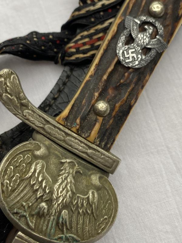 A rare example of the shorter Police bayonet from the early 1930’s with stag grips and clamshell. All heavy solid nickel fittings. Shorter bayonet and untouched. Aluminium police badge pinned to the grip. Black leather scabbard and frog. Has original cloth Police portapee tied to the frog. Nickel fittings pinned to the scabbard with staples. Short single edged blade with 1930’s Alcoso trademark stamped to reverse of riccasso. As I have mentioned many times before, police bayonets can be a complete collection on their own as there are SO many period variations.
