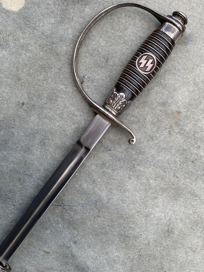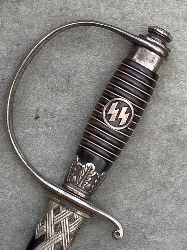 Always an impressive piece, and unlike the daggers, all SS officers dagens/swords were AWARDED and then presented. Not every officer was entitled to wear one. This is the much more ‘common’ slightly later version which had steel fittings which were nickel plated throughout. A nice D guard hilt which shows some slight wear and useage. Top pommel cap unscrews to show the tang nut cover intact etc. A very nice black ebony wood grip with the horizontal parallel nickel grip wire. The SS button is firmly fixed to the centre. There is a tiny chip in the grip on the reverse near the pommel. Very small. Scabbard has most of the original black paint intact and nickel plated steel fittings upper and lower. The scabbard throat as well as under the hilt crossguard are stamped with the little SS ‘ Kulturzeichen’ stamp. The mint blade is completely plain and devoid of any maker, which is VERY common on SS dagens, especially the later ones. The original white/cresm leather sword buffer is in place. The sword is quite long (never seen a short one!!) measuring 39 1/2 “ overall with a 33“ MINT blade.