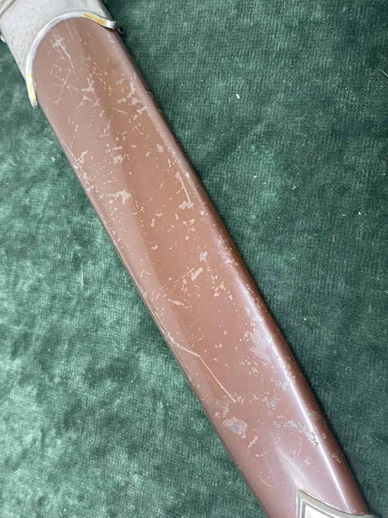 Purchased from a man in Norwich whose father returned from WW2 with this as a souvenir. He said his brother and he were occasionally allowed to play with it in the house when they were small!! One of these caused quite a stir on a recent DTC opening with Tom Wittmann and Robbie, so a lot of people like the ‘Bismark’ maker. All solid nickel fittings that has not been cleaned. Super mid colour wood grip with SA button and nickel eagle. Lower crossguard marked with Gau Ns stamp. The scabbard is really quite special. It has 98% of the original factory lacquer over all surfaces. There are just some very light handling and wear light scratched. There are a couple of indentations in the very edge of the scabbard under the right ring fitting. Looks like it was used to tap something in. Not noticeable and I did not see them initially. Lower scabbard fitting is perfect, no dents to the ball.