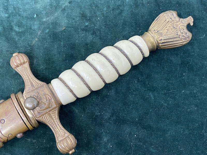 As in the past, if I manage to find and buy something at a reasonable price, I will happily pass it on to my customers. This is a very decent (not mint!) Third Reich naval officers dagger by Eickhorn. Totally uncleaned so the all brass fittings have gone dull. A perfect celluloid over wood grip with twisted grip wire. Nice scabbard with no dents or damage. Blade again is uncleaned and is a little tarnished in places, mainly the riccasso. ORIGINSL brown felt buffer in place. No damage to the blade with needle sharp tip. Clear and deep etching to both sides. Eickhorn 1935-42 trademark stamped into reverse riccasso.