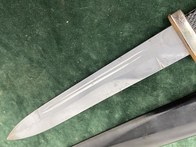 A recent purchase from America, this is a mint example of this type of unusual dress bayonet. I’m not sure how these have been labelled ‘pioneer’ bayonets, as there is no period reference to them being called this at all! They are pictured in the Eickhorn and WKC period catalogues but just have production numbers etc. No name. All of them feature the crossgusrd WITHOUT the upswept quillion. This was just a new design tried out by these companies, but it did not prove very popular so hence they are quite rare to find. This one has 100% of the ORIGINAL nickel plated hilt etc. Perfect chequered crossguards and mint untouched black painted scabbard. The nickel plated carbine type blade, with false edge, is in very good condition. A couple of old finger smudges. No damage, no sharpening.