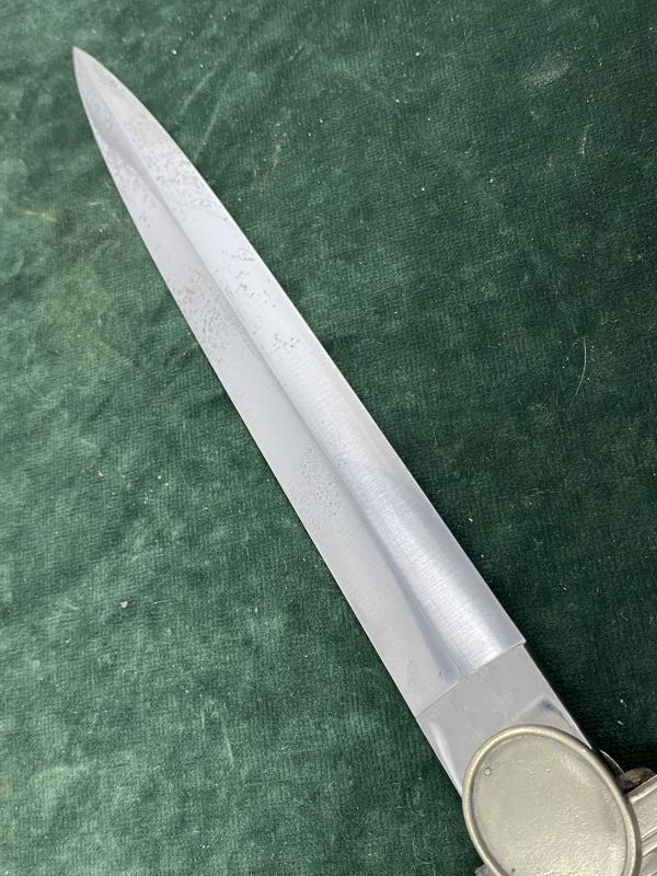The blade is 99.9% stone mint with all the crossgrain polish down both sides. There is some VERY light ‘hazing’ to the surface very near the tip, but very hard to notice. There are never any makers marks on these blades. These daggers were carried by Red Cross and Social Welfare officers. The only think that differentiates them from each other are the STRAPS! (not the scabbards, this is PURELY manufacturing design differences). A REALLY nice looking dagger.