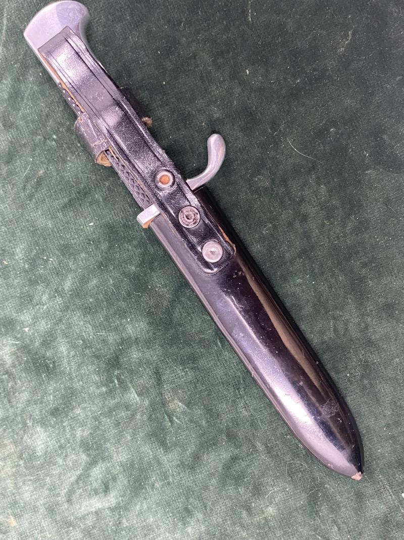 These are super little, absolutely period, knives. I’ve had one in my own collection for over 30 years. A lucky find at the SoS show in Kentucky. This one is in mint condition. No one is exactly sure whom these were meant for, or even if they were unofficial knives you could buy privately. The collecting community has labelled thrm DJ knives, for use by the Deutche Jungvolk, the pre-cursor to the Hitler Youth. All of these period knives are exactly the same. Aluminium hilt, chequered Bakelite grips. Black painted steel tubular scabbard. Leather hanger with belt loop and little cross strap with popper. The blades are quite thin compared to a bigger HJ knife and have a small’bowie’ knife profile. All have a brown felt blade buffer too. Most have a plain scabbard, but a few have a HJ enamel diamond pinned to the center of the scabbard. These are MUCH rarer!