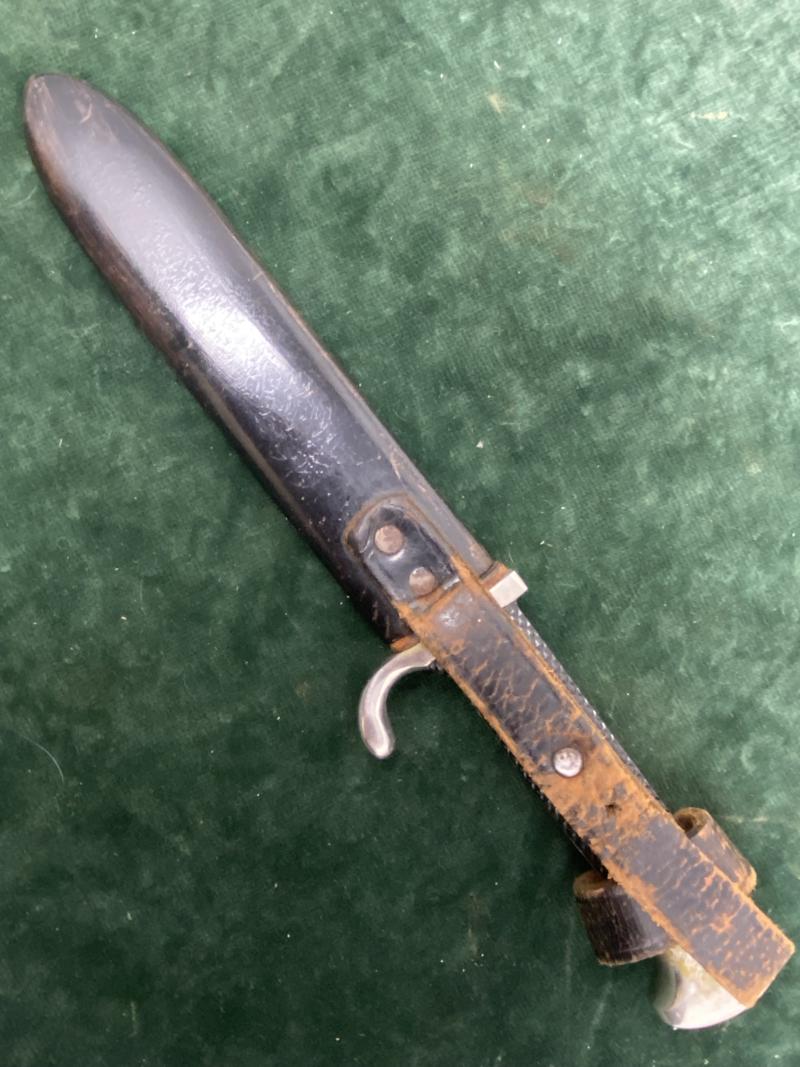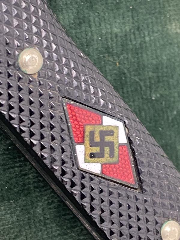 This is one of those HJ knives that ‘speak’ to you! You can see it’s been used and worn, but remains in highly collectable condition with great character. Steel hit is heavily nickel plated and in perfect condition with no evidence of wear. The black chequered grips are perfect and the enamel HJ diamond is fault free. The steel tubular scabbsrd is is in near perfect condition with just a little use and has all the original black paint. The black leather belt loop and cross strap with popper, is nice and supple with no damage. The blade is very early and has no riccasso. The lesther blade buffer is present. The blade itself is VERY clean and is super condition. It shows VERY slight sharpening. The Blut ind Ehre motto is deeply etched and very clear. The reverse riccasso is stamped with the makers name HERM. KONERJUNG A-G and underneath their trademark of a pair of old spectacles (glasses).