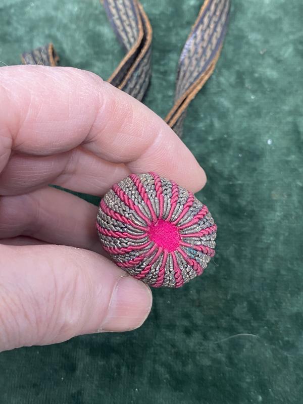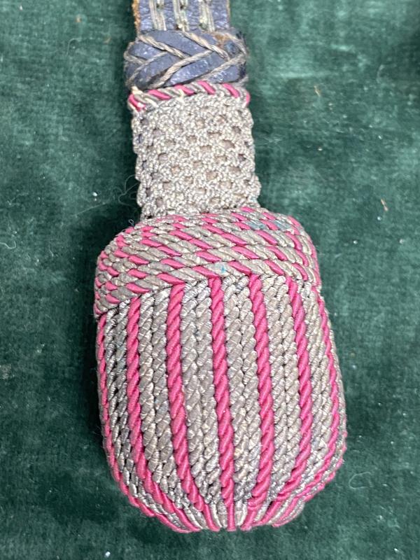 This seems to have been tied to a bayonet and removed. In very nice condition, it has all aged to a nice patina. Black leather strap with triple silver wires. These have become a ‘golden’ colour with age. Leather very supple. The bullion acorn ball has the usual alternation red/silver threads, which have also gained some age patina. The bottom of the acorn has a bright pink/red stuffing. Complete your fire bayonet with the correct original knot.