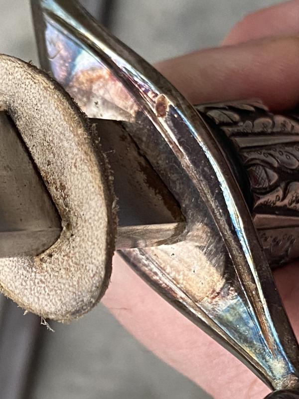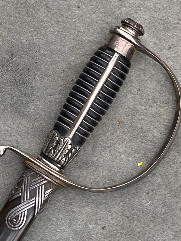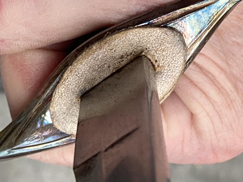 These were legitimate parade swords that could be purchased by the Officers themselves and worn accordingly. The actual SS OFFICER DEGEN. was presented only, you could not go and buy one yourself. These candidates swords are virtually identical the the SS degens but do not have the large SS button inset into the grip. They are also constructed in a different way, insomuch as they are made like police officers swords and the top pommel unscrews which holds all the grip and hilt onto the blade tang. SS degens are not like this. Sword is in very nice overall condition. Nickel plated steel hilt. Black ebony wood grip with single vertical wire wrap. Unusually this individual has had a nice enamel SS runes button professionally inset into the pommel cap. Lovely work. Scabbard is anodised/blued instead of being painted. Upper and lower fittings are attached by headless screws. There is a white leather blade buffer. The blade is very nice indeed and has the Eickhorn 1935/42 squirrel deeply stamped into the riccasso.