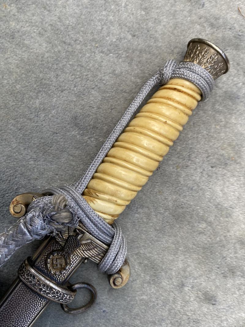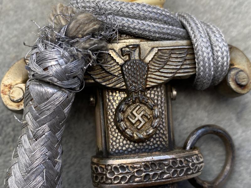 Whist most army daggers are still relatively common, there are a few much rarer makers, made by smaller manufacturers and therefore produced in smaller numbers. This is a perfect example of a much more unusual maker. A. SCHUTTELHOFER &Co Solingen Wald. Their great trademark is ASSO with twin hobby horses above. SCHUTTELHOFER did not make complete daggers from scratch so most of the parts were bought in as generic. Crossguard etc etc. it has a cresm celluloid over wood grip. Nickel plated over alloy fittings. There is an original to the piece 42cm bullion knot, which seems to have never been off and is a little frayed where it comes out of the tie. Scabbard is dent free and has all the original plating. Blade is in stone mint condition with all polish crossgrain etc. The reverse blade riccasso has the ‘Asso’ trademark very clearly etched into the surface. A great one for the type collectors out there.