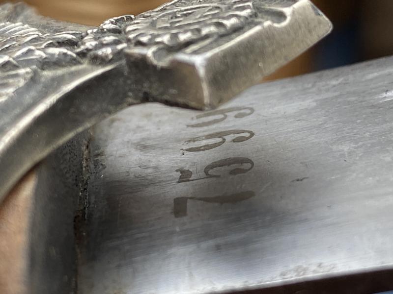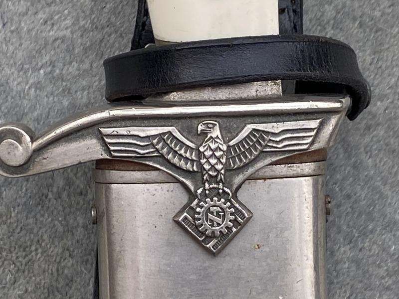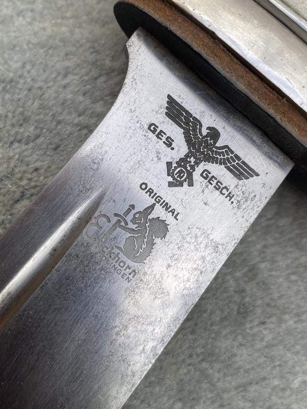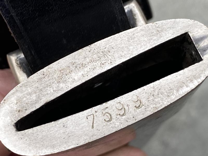 This is an exceptionally good example of the large TENO hewer carried by the men and NCO’s of the TENO, (abbreviated from Technische Nothilfe). All TENO daggers were made by EICKHORN as they had the exclusive contract. All daggers were numbered (both mans and officers). This dagger has near perfect nickel plating to ALL the hilt and scabbard fittings. They are very prone to the plating lifting and this has NONE of that. Perfect cream celluloid grip plates. Scabbard paint is completely original with just some spidering to the surface. The dagger has the ORIGINAL black leather heavy duty ‘frog’ which is clipped to the rear scabbard mount and consists of an Assmann marked snap clip and heavy duty leather belt loop. It also has the narrow leather retaining cross strap which on most examples is missing or broken as it’s not designed very well!!! The blade is in mint condition and similar to the RAD hewer has a large, slab sided ‘Bowie’ type blade. The Eickhorn trademark along with the unique TENO eagle is deeply etched into the reverse blade riccasso. As I mentioned, all TENO daggers are numbered. This has the numbers 7599 etched into the blade and stamped into the top of the scabbard throat. A really nice conditioned dagger.