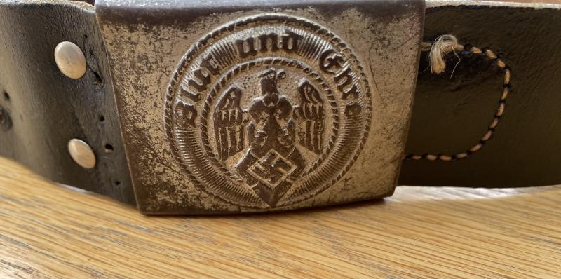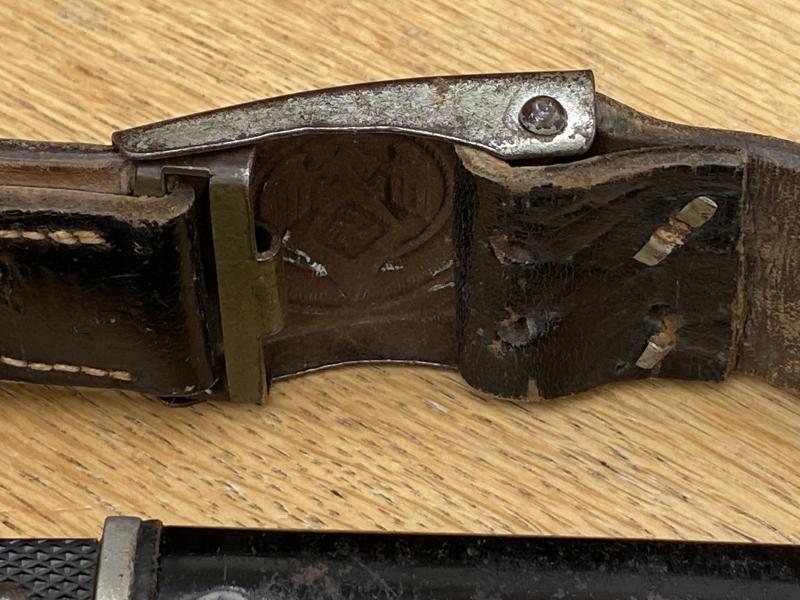 The belt is thick black leather and stamped at one end with an Rb number. It’s been period shortened and permanently attached to the steel HJ buckle. Made to fit a very small HJ boys waist! It’s only 28” or less in circumference! The buckle is nickel plated steel and has been worn a fair bit. If there are maker marks, they are hidden under the belt attachment around the adjusting claw.