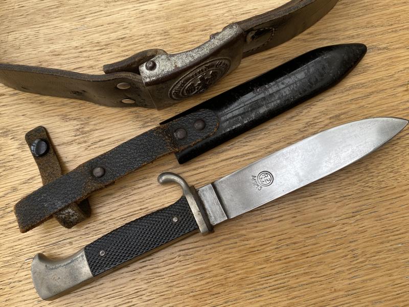 A nice pair of item which according to the vendor were bought back together and have been in the family since. Consists of a very nice HJ dagger, post 1938, so no motto, but in excellent condition. Uncleaned and with 99% of the nickel plating over the hilt parts. Perfect chequered grips with perfect HJ diamond. Scabbard has all the original black paint and complete leather belt loop and cross strap with popper. The blade is extremely clean and bright. Reverse has deeply stamped RZM M7/13. This is the Arthur Shuttlehoffer company.