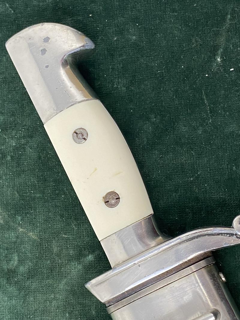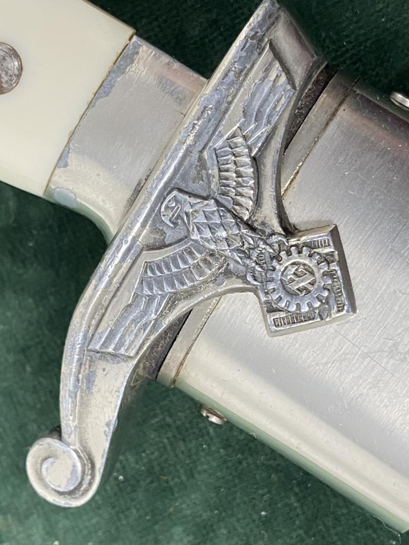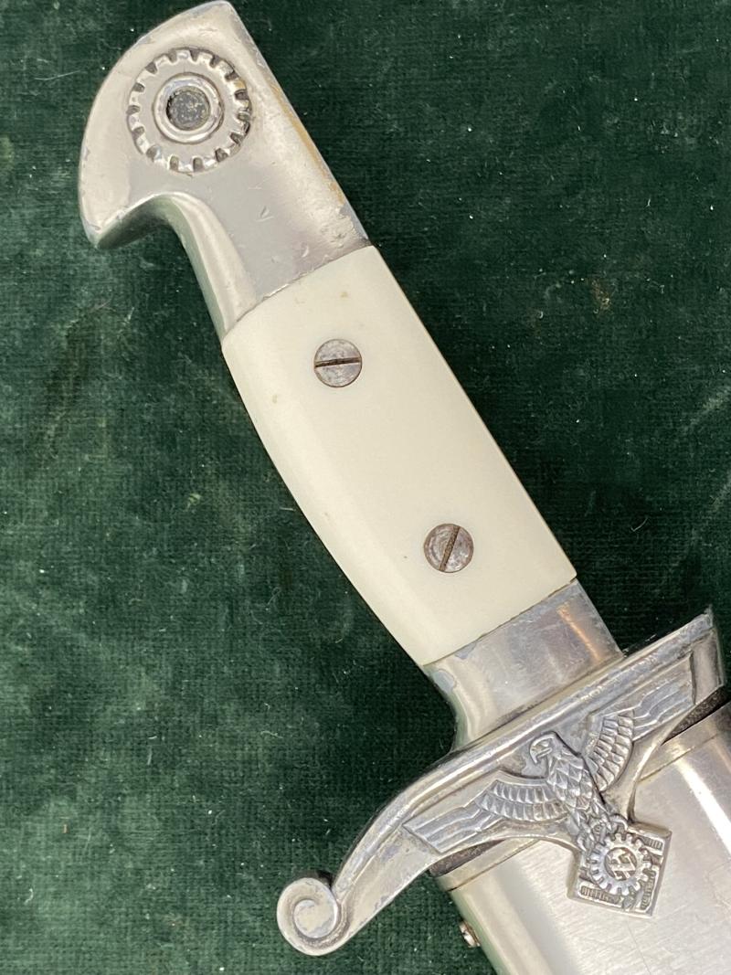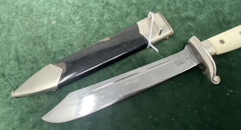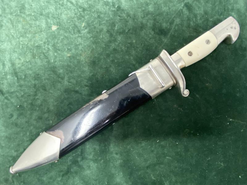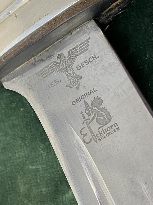 I am very pleased to offer another one of these rare daggers. Again, this one is in near perfect shape with just two tiny spots of lifting on the rear of the pommel. Eickhorn were the ONLY maker for all the TENO daggers. Very nice cream celluloid grips. TENO eagle crossgusrd. Scabbard in great shape with 95% of the original black gloss factory paint. The large ‘Bowie’ type blade is again in perfect condition. No damage or sharpening. All TENO daggers are numbered. Both Officers and Mans. The issue number is stamped into the scabbard throat and then either etched or stamped into the blade on the riccasso hidden under the crossgusrd eagle. This one is numbered 1589 in both places.