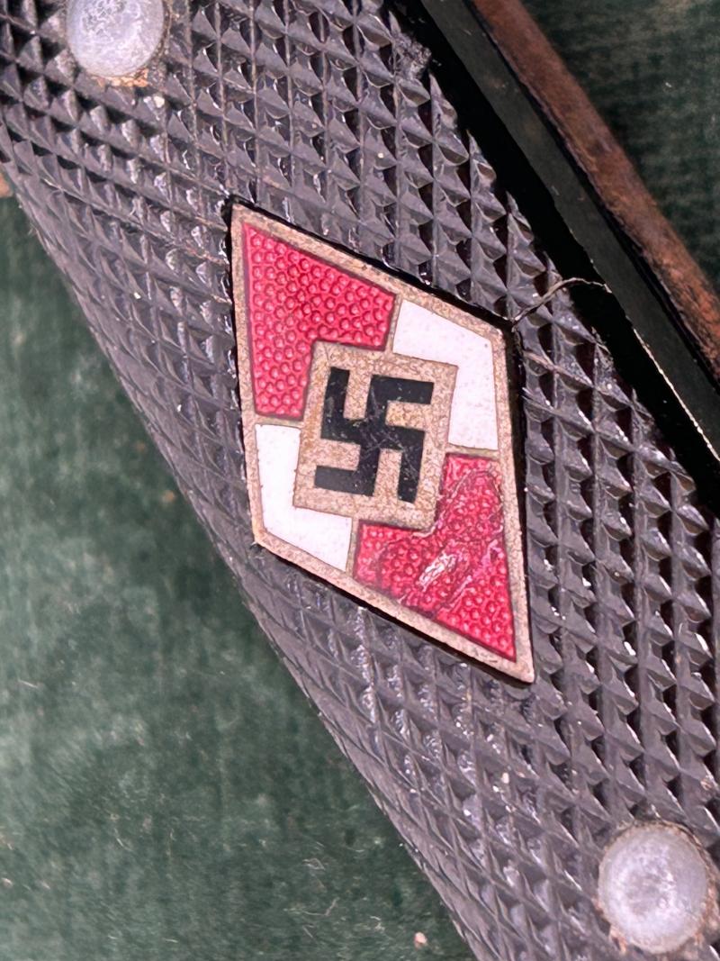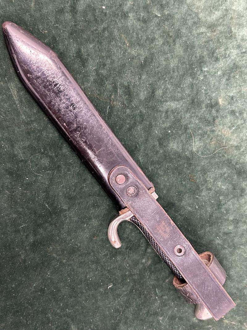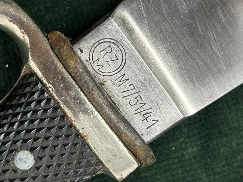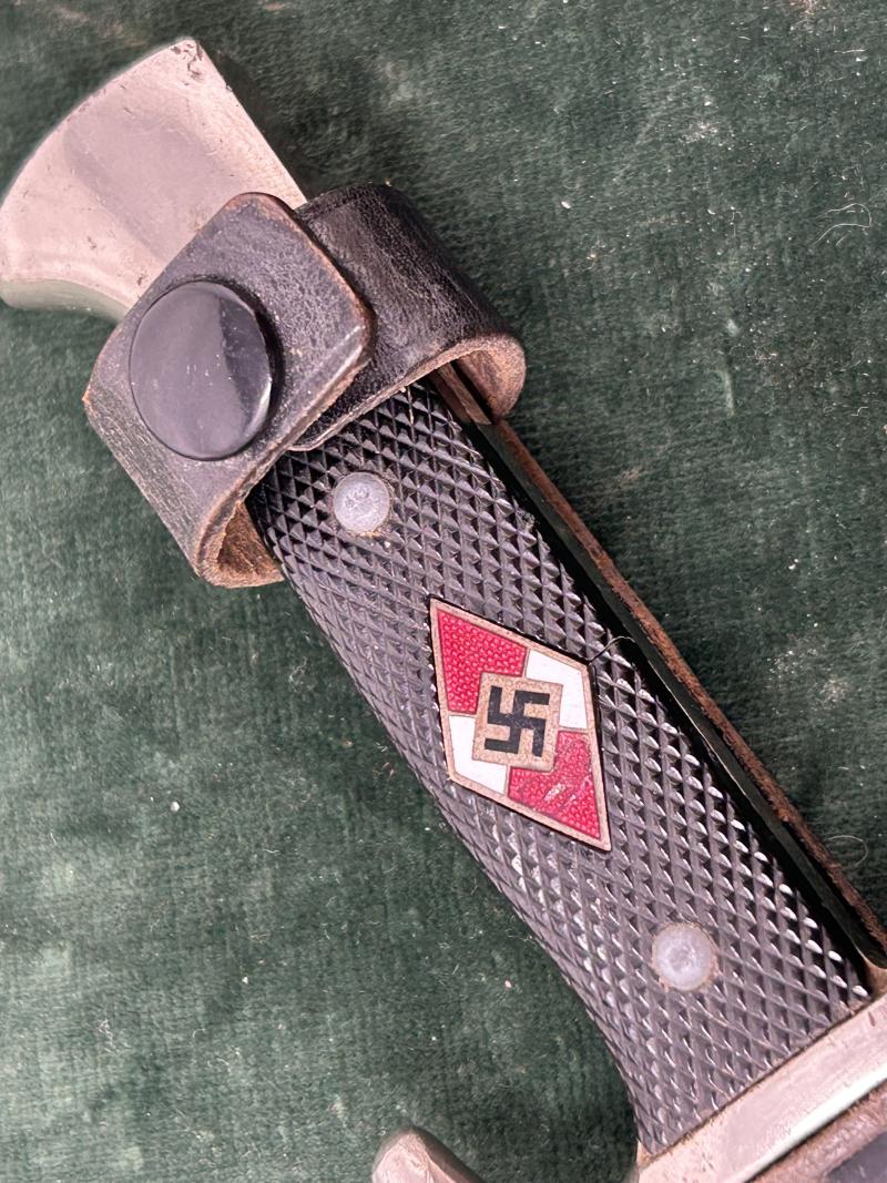 A really nice example of a HJ dagger made in 1941. It has a very nice plain blade as the motto was withdrawn from 1938 (later part). This is a quality dagger and has a solid steel hilt etc. A fully nickel plated hilt and crossguard with no lifting or wear. Perfect chequered grips with enamel HJ diamond reset into the grip. HJ diamond has a very, very small chip to the lower red half, but nothing missing. Scabbard has all the original black factory paint. Scabbard leather belt loop and cross strap are in perfect condition. The blade is very clean indeed. Has very minor light sharpening near the tip on one side, but VERY light. The blade riccasso has the full RZM code on the reverse. RZM M7/51/41. This is the code for Anton WINGEN Jr. with the date 1941.