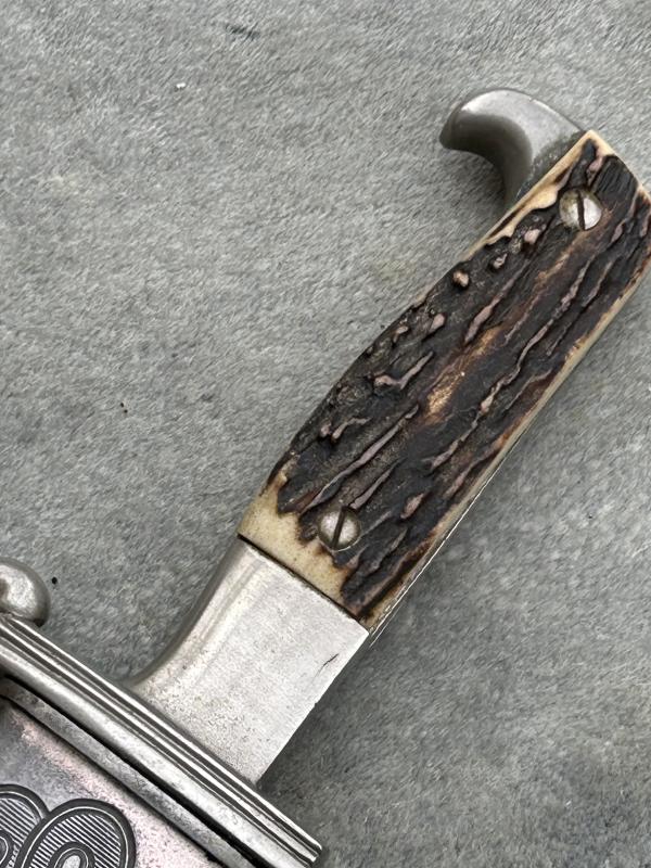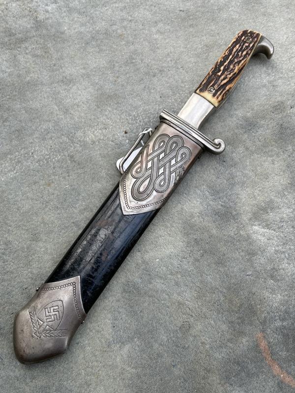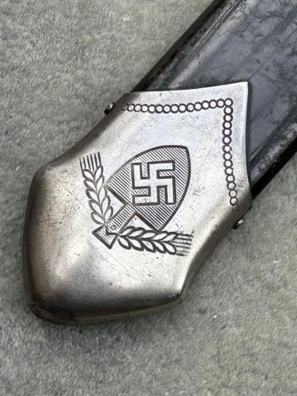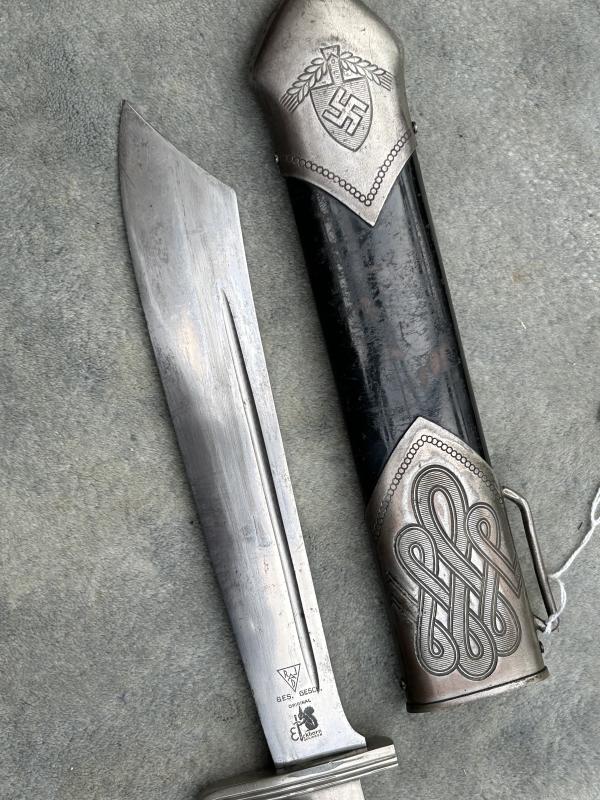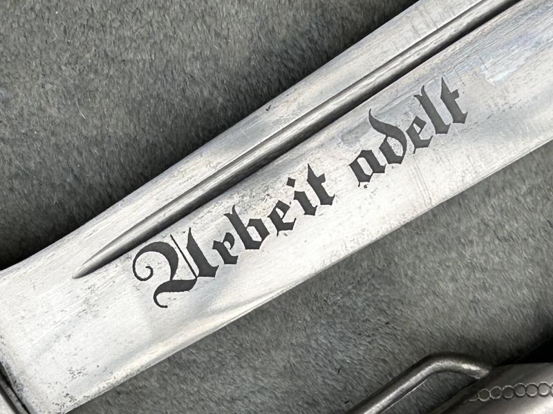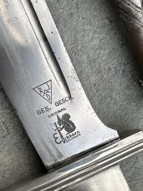 A fine example of the RAD man’s hewer, at an VERY special price. Originally worn by ALL members of the RAD from about 1934 until 1938 when the Officers version was released. This is a fine example made by EICKHORN and has a near mint blade with the Eickhorn squirrel trademark used from 1935-1941. It also has the RADJ symbol above it. Perfect stag horn grip plates. Steel nickel plated hilt with all the plating. A very good scabbard with all the original black factory paint. Lower scabbard fitting in excellent UNDENTED condition. The blade, as mentioned is in near mint condition with a very deep and cleat RAD motto ‘Arbeit adelt’’. A very impressive dagger.