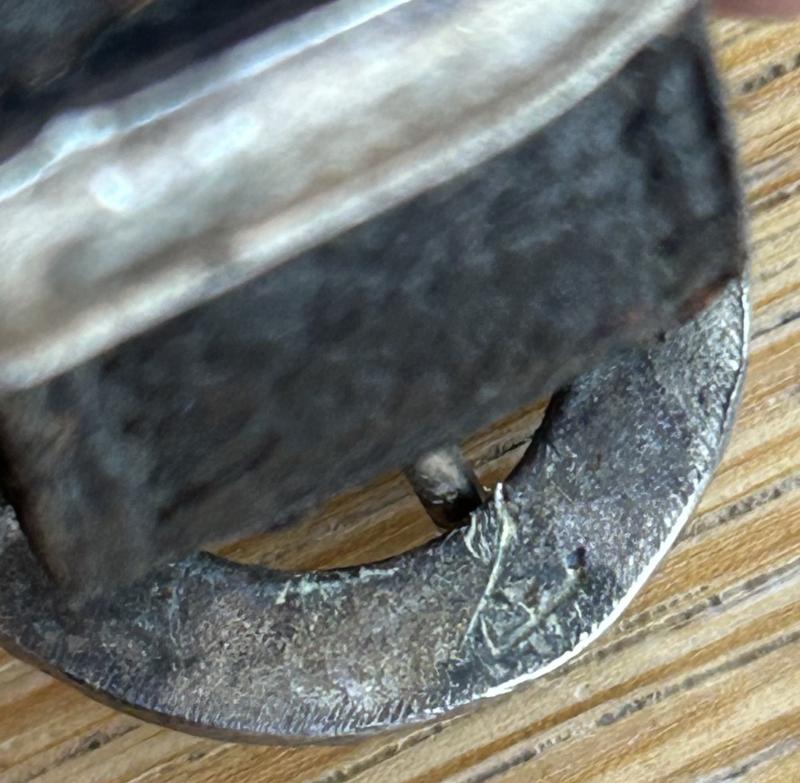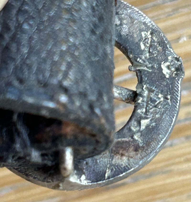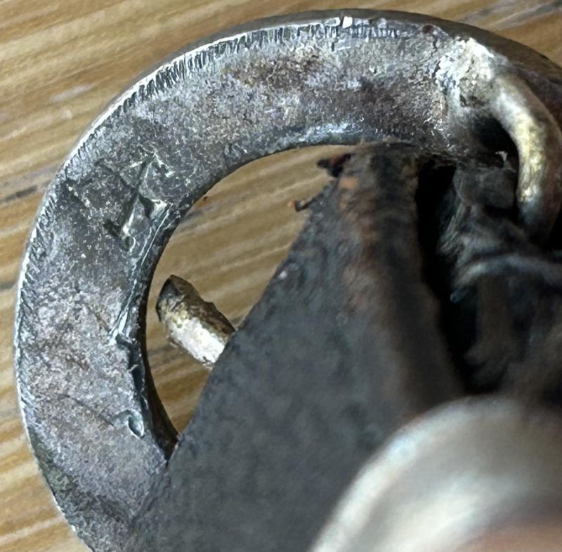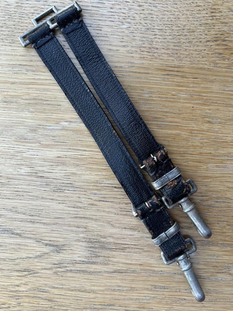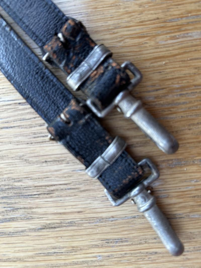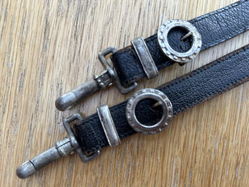 This is only the second ORIGINAL set of black leather hangers for the TENO OFFICERS DAGGER I have owned in perhaps 40 years. These are classified as one of the rarest and hardest hangers to find, ranked along side HJ Leaders hangers. There are 2 types available for TENO daggers. This ‘day’ set and a silver bullion set that have twin black stripes and black velvet backs. These are the ones that don’t turn up!! Fine quality twin leather straps with aluminium fittings. Standard ‘box’ type top fitting and standard type ‘push in’ type. The round buckles are cast in the shape of cog wheels, which is the symbol of the TENO organisation, are are both stamped on the reverse with the ASSMANN letter A. The slides are plain and slightly pebbled. The show a little honest wear to the high spots on the leather and lots of old patina and age behind the hardware etc. No cracking or damage to the leather, which remains beautifully supple. If you have a TENO officers dagger and are looking for a set of ORIGINAL hangers, look no further!