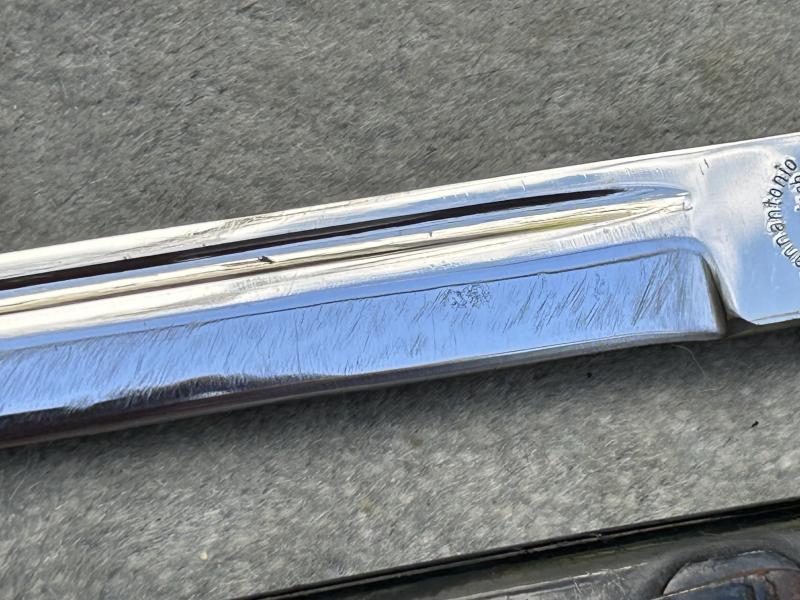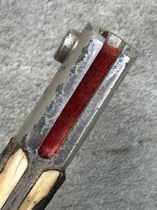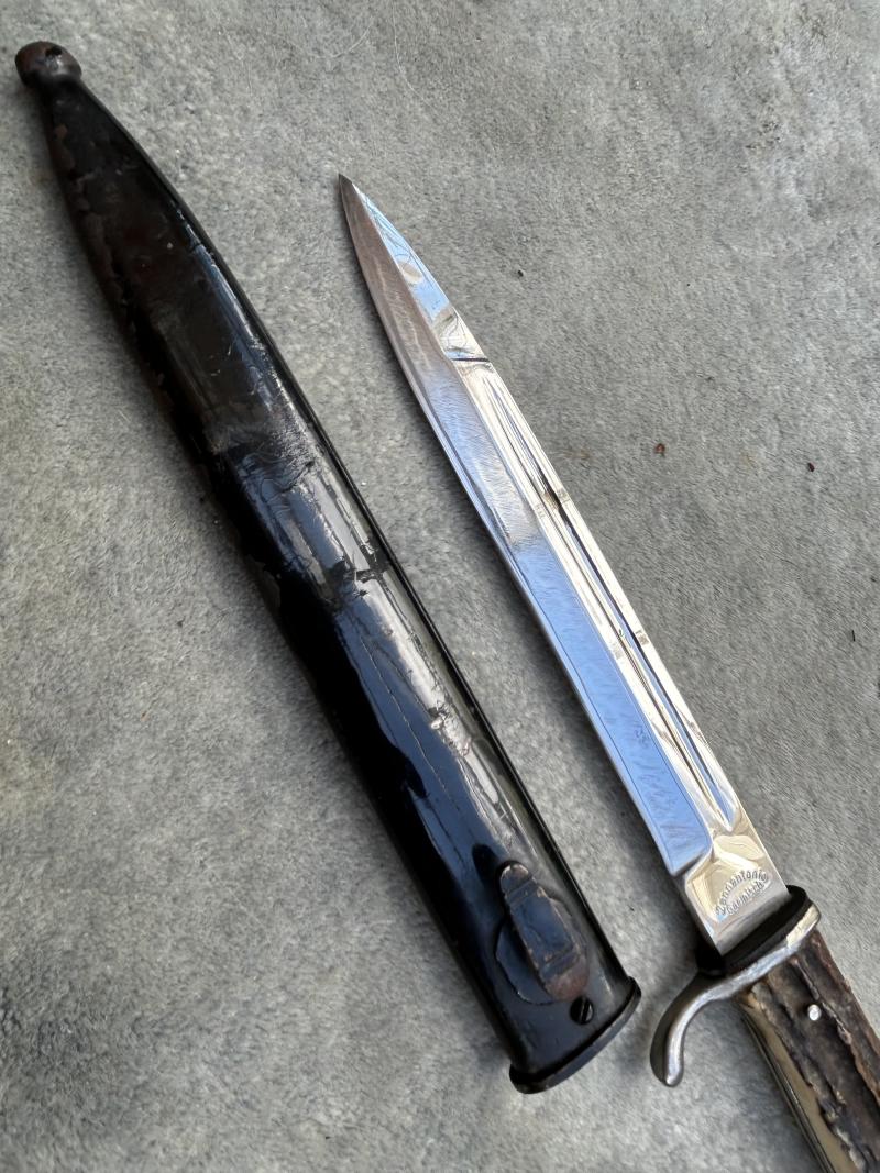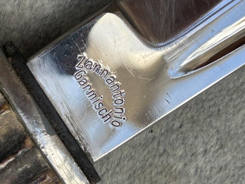 Just a little different and ideal for those you collect different makers or distributors. A decent nickel plated dress bayonet with perfect stag grips. Has red felt in the mortise slot. Original black paint to the scabbard. Nickel plated blade which seems to have had some light sharpening at some time? Leather blade buffer. Reverse riccasso is deeply stamped ZANNANTONIO GARMISH. I’ve never seen this before. Garmish Partenkirchen is in the Alps in Germany. No idea about ZANNANTONIO. Something a bit different!
