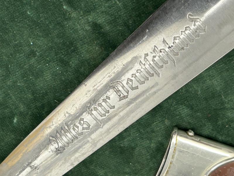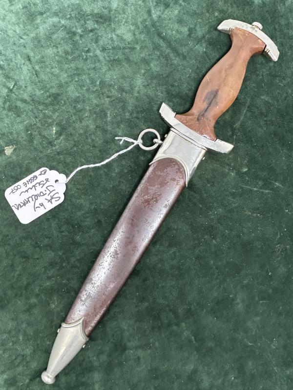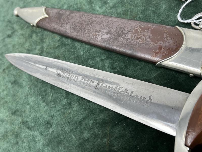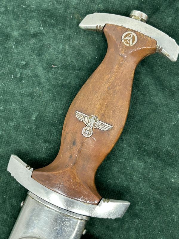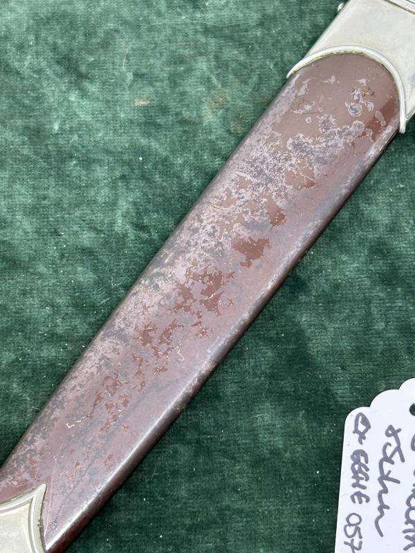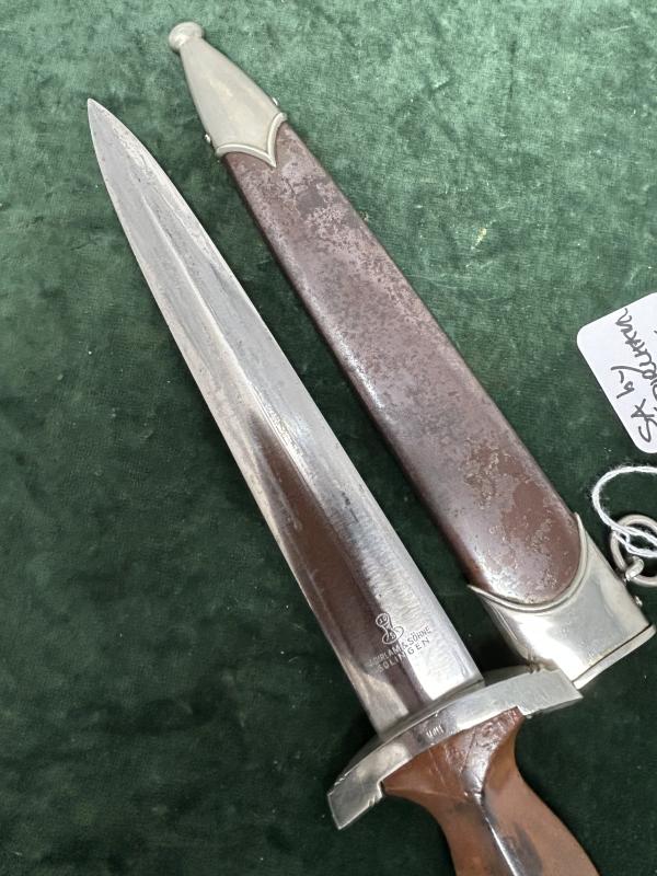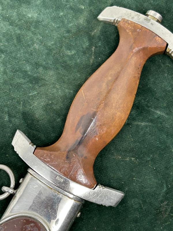 A very nice example of an early SA dagger with yet another maker I’ve never heard of! All nickel fittings, unclaimed for quite a while so nice patina. Mid-colour wood grip with interesting dark tones to the reverse. No damage. As button and nickel eagle. Lower crossguard marked with Gau Nrh ‘Niederrhein’. Scabbard is wonderful. Has all the brown ‘anodised’ finish and 75% of the original lacquer over the top.
