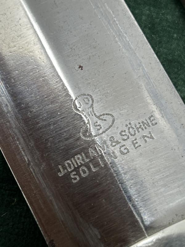 Blade is very near mint with a couple of minor finger smudges. Remaining has all factory crossgrain polish. The maker trademark of a ‘hand stamp’ is etched to the rear riccasso. J. DIRLAM & SOHNE SOLINGEN underneath. This is a pretty rare maker, rated 8/10, so nice an unusual.