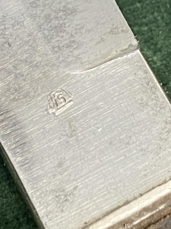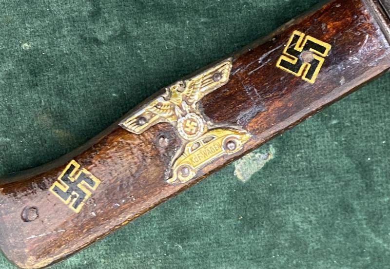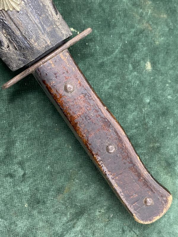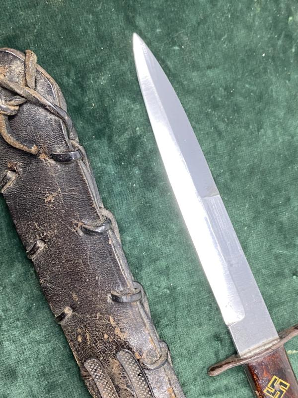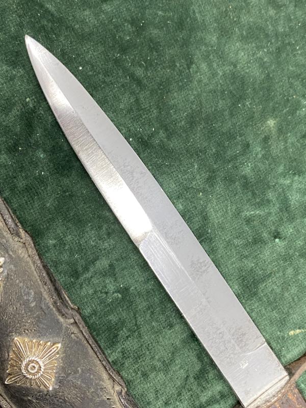 I’ve never had something quite like this before. It’s a standard Luftwaffe fighting knife, with a mint blade and marked with inspection stamp ’5’ on the riccasso, but there the similarity ends! The original owner has personalised the grip on one side by inserting a little metal eagle and swastika over a period badge of one of the first VW Beetle cars. This has ‘Kdf wagon’ written on it. Beside these badges are two swastika transfers. Then the whole grip has been period varnished. IN ADDITION, the original owner has made a black leather cover that slides over the scabbard. It’s been made so the spring clips on the reverse still work. The leather cover has been embellished with 4 Officer/NCO rank pips from epaulettes. Extremely well done and the original owner obviously took pride in his knife.