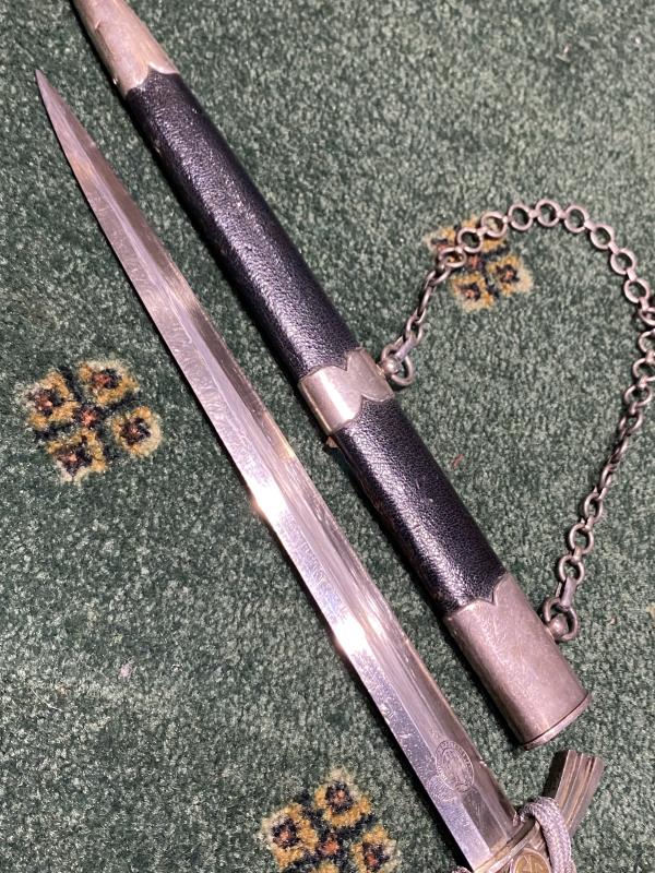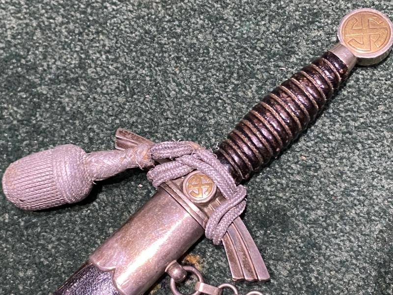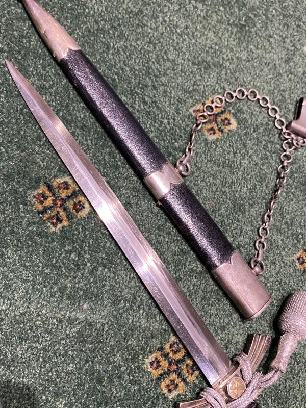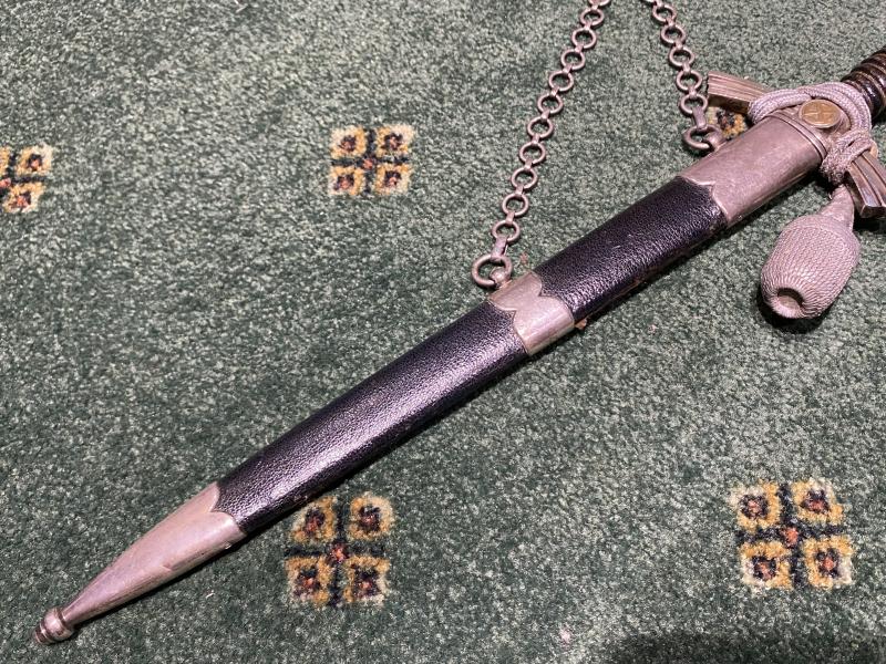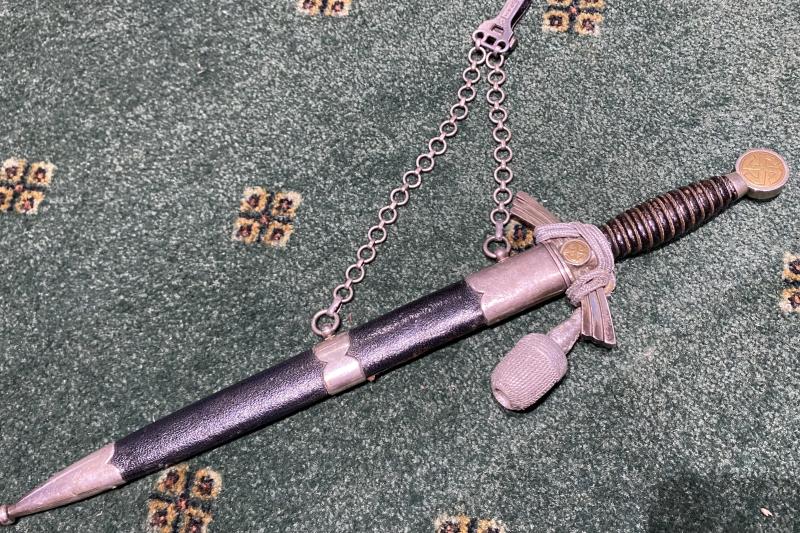 A classic early Luftwaffe dagger. All nickel construction with very nice scabbard and grip leather. This 1st type Luftwaffe dagger was introduced in 1935 and was worn by all serving Luftwaffe OFFICERS only. It was was replaced by the 2nd Pattn Luftwaffe dagger introduced in 1937. The original 1st type continued to be worn by senior NCO's but not in nickel. This is a lovely example and has remained untouched and uncleaned. Heavy silver content in the nickel fittings. Near perfect blue Moroccan leather to the grip and scabbard. Solid nickel chains with a DRGM marked snap clip. There is an original 23cm portapee tied around the grip and crossguard, which again looks to have been with the dagger for a long time. The heavily nickel plated blade is in mint condition throughout and is etched with the oval Weyersbery trademark and a little Waffanampt 'stick bird' inspection mark above it.