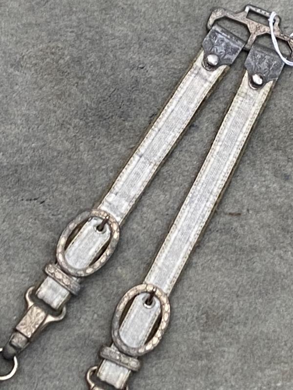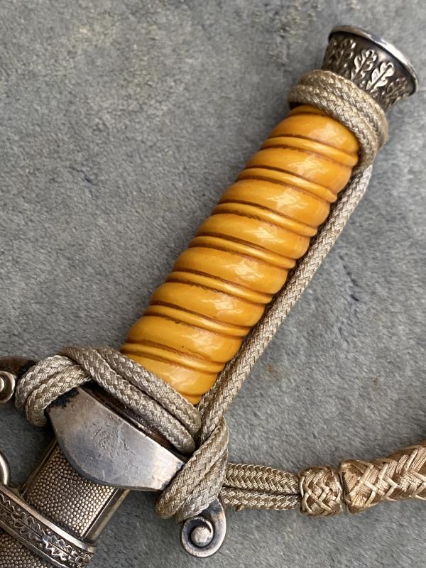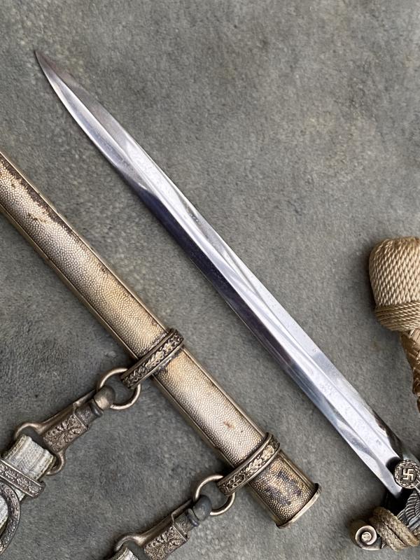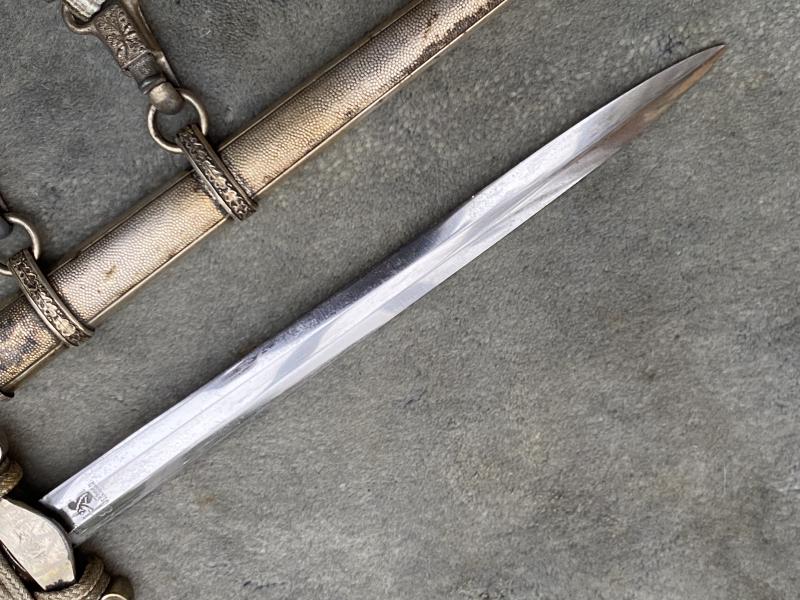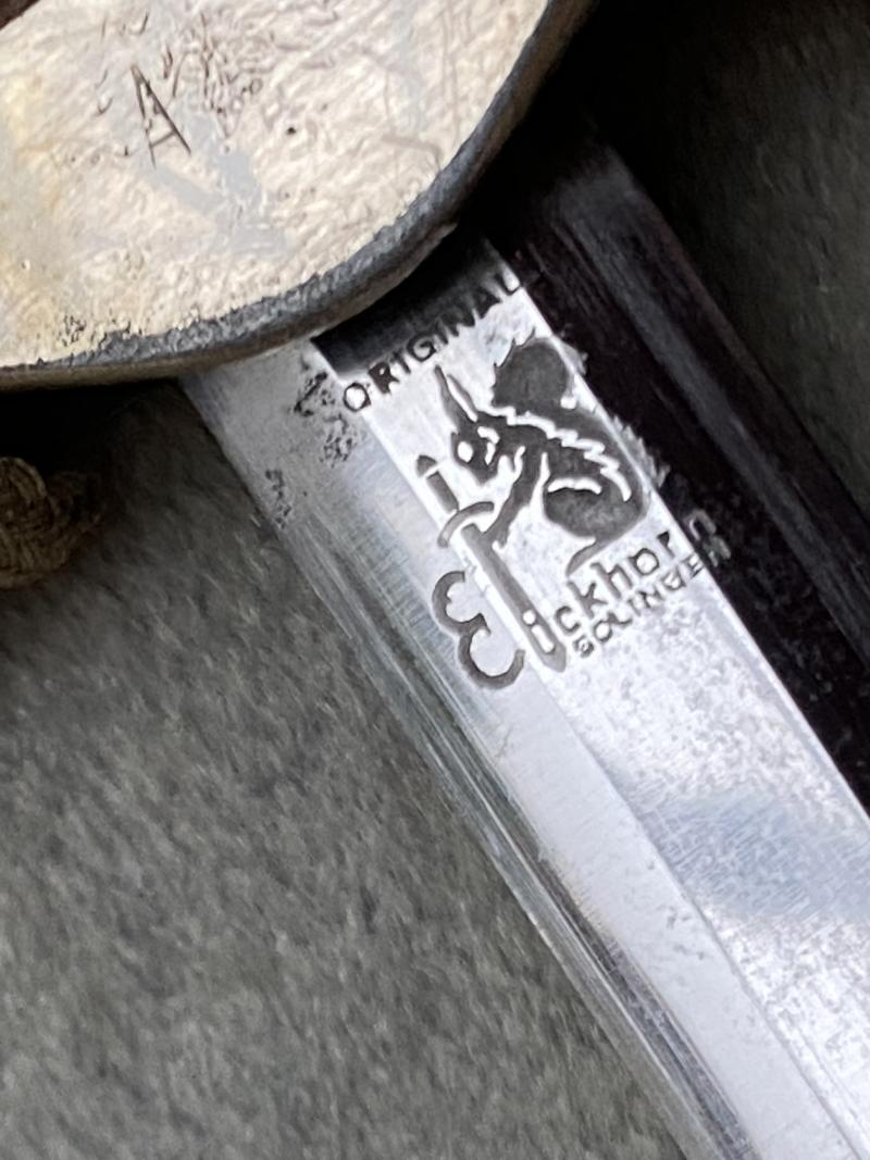 I always am pleased to purchase a complete dagger, and one thst looks to have been together for ever. This was a private purchase at the last Thetford fair. This Eickhorn army dagger has been untouched and uncleaned for MANY years. It has a high silver content silver plated scabbsrd with no damage, that has developed a very nice ‘silver patina’. Quite a deep orange celluloid grip and one of the period rayon knots which always go quite a golden colour. Eichorn 2nd type crossguard, again toned with patina. A very nice set of straps which show a little proper use of rubbing against a tunic. De-luxe push up lower clips and very nice metal ‘swing’ tops. Nice straps!! Blade is nickel plated and in virtually mint condition. The reverse riccasso has the 1935-42 Eickhorn squirrel trademark.