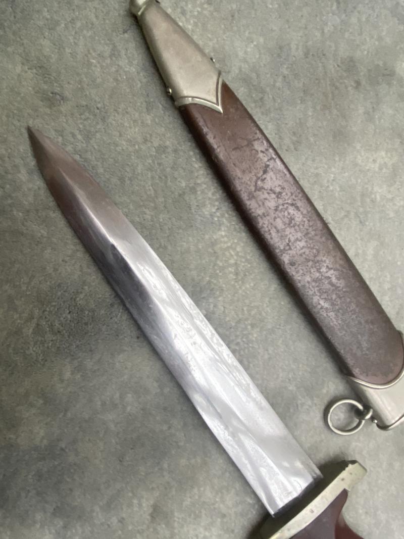 The history of these pieces is well known by collectors and this is an example of a very well done, but not factory erased Rohm blade. All early nicks fittings of course, as this was made in 1933/34 and given to all of Ernst Rohm's supporters. Nice dark wood grip with nickel eagle and perfect SA button. All fittings remain completely uncleaned and the nickel, mainly on the grip crossguards has turned a dull smokey colour. Lower crossguard has the Gau letter B for Berlin. Scabbard is undamaged , no dents and has all of the brown anodised surface coating as well as most of the lacquer, but with lots of surface scratches only to the lacquer. Unfortunately the dagger was dropped at some time and has crushed the lower ball. All scabbard screws are present. The blade is in very good shape, some surface grease marks, but I have just left it as I found it. It will probably clean up (if desired) to near mint condition. The reverse blade has had the Rohm inscription completely ground off. It’s been done well, but quite deeply, especially where the Rohm signature was and you can really see the indent in the blade metal spine! In doing so they have also removed 75% of the Eickhorn trademark. This is the very small oval type used on most, but not all early Rohm SA daggers (and after 1934 non-Rohm daggers). This trademark was used from 1933-1935.