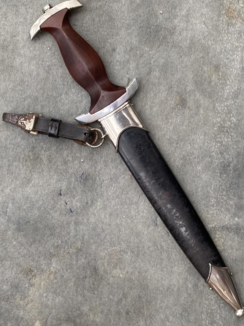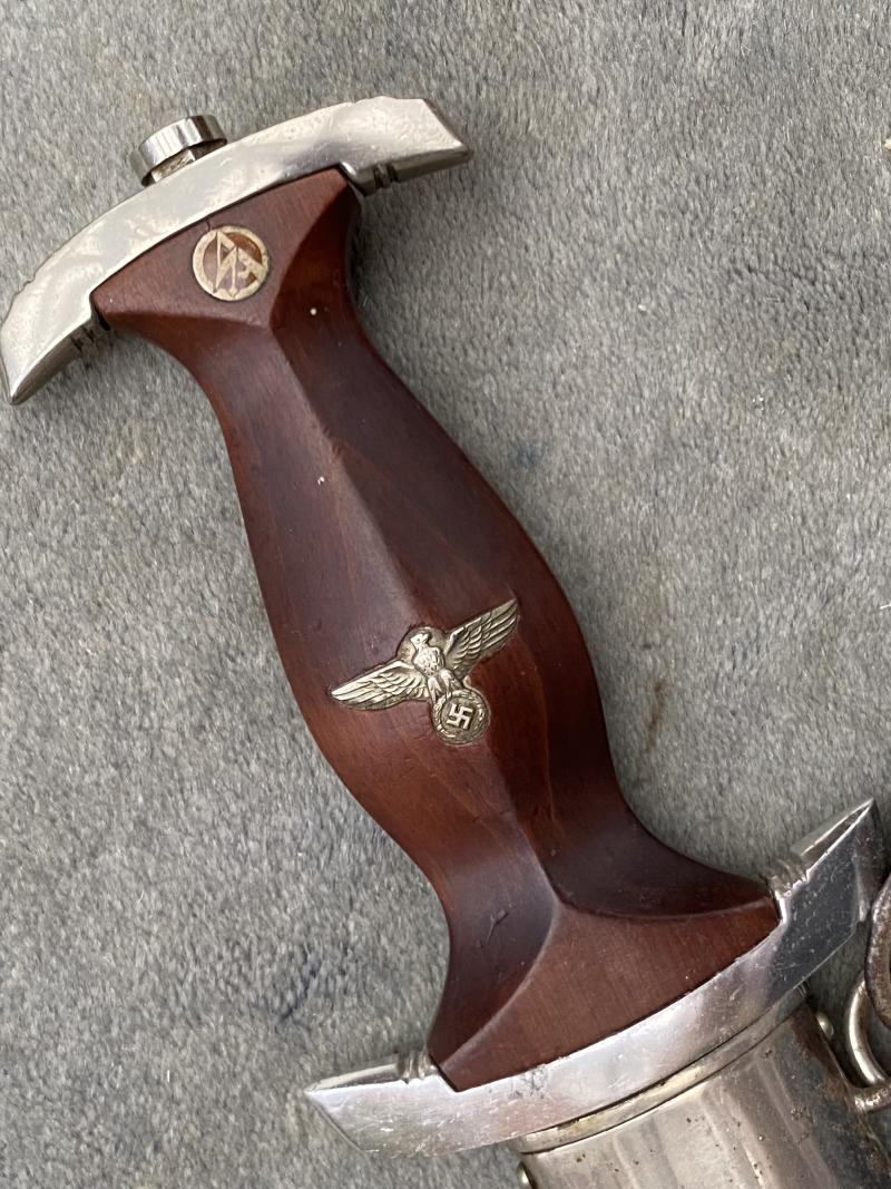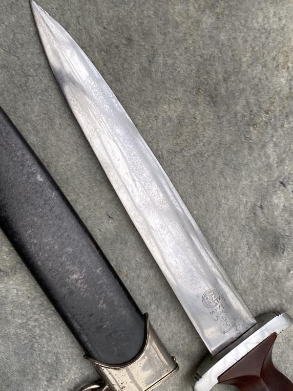 This hobby always throws up something different and whist on this dagger the differences are subtle, they are what they are. Never been in a collection and purchased directly from a house clearance, it has not been touched since. This is what we call a ‘transitional’ piece where one type of production period was ending and a different one began. This dagger exhibits both some early features and then some later ones. A nice undamaged wood grip with a nickel eagle. Nice enamel SA button. The crossguards are different and have always been so. Top one is solid nickel, lower one is aluminium! Both fit perfectly. The factory black painted scabbard shows a little surface age to the paint, but it is all there. Upper and lower fittings are nickel plated steel. There is an original short leather hanger and clip which shows some oxidation but the hanger has been there for ever as the leather is too stiff to remove. The blade is quite nice, some very light surface ‘staining’ to the lower half but it just looks a little cloudy really. Crossgrain visible on 50%. SA motto is clear and well etched. The reverse has an unusual double makers mark. That of Carl Julius Krebs along with the RZM circle and code M7/5. Julius Krebs is not a common maker at all and the fact this has both RZM and makers trademark, puts it in the ‘transitional’ bracket.