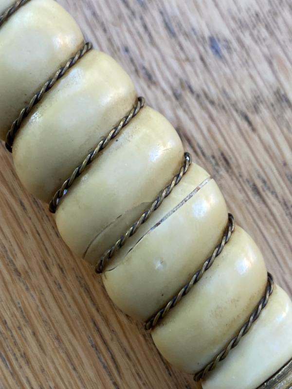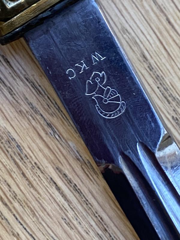 A very nice example with quite a lot of fire gilding left, which has given it a very ‘antique’ look. All brass construction with a faultless, undamaged scabbard. Typical detailed pommel with WKC casting. A very cream coloured grip in celluloid. Very nice age to it. Complete with the original twisted brass wire. There is a hairline crack around the middle of the grip and a tiny chip under the pommel. Unfortunately VERY common with navy daggers as the wood base shrinks (or expands) and damages the celluloid. It’s actually not noticeable. This dagger has a WKC maker marked blade but it is not etched. A mint plain blade. An etched blade was actually an extra cost option with some makers. So to save money, many naval officers opted to just have polished steel. Plain blades are actually much rarer to find than etched ones! So if you are a serious collector, you need an example to complete a comprehensive collection.