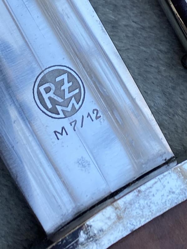 Another fine example of a RZM period dagger. In beautiful condition throughout. These later produced RZM daggers are prove to plate lifting and crossguard corrosion, but this has none of that!! A great hilt with perfect mid colour wood grip and perfect plated upper and lower crossguards. The grip eagle is a copper colour so probably the original silver flash coating has worn off over the years. A perfect scabbard with ALL the original brown factory paint! It also has its original TRIPLE hanger which has a RZM marked clip as well as RZM marked short leather hanger dated 1940! This dagger has everything!! (This triple hanger on its own is worth £250). Blade is stone mint with all crossgrain polish, deep colour to the motto and the RZM circle and code M7/12 for MAX WEYERSBERG. You can’t lose with this piece.