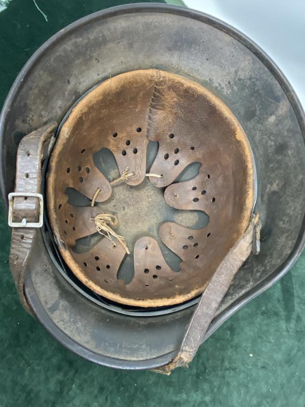 Not a dagger I know, but I am offered other great items of original militaria, so I like to buy them when I can! This is a really good example of an untouched, unmessed with M40 single decal M40 steel helmet. Original dull apple green paint is 85% complete. Side silver decal is virtually undamaged and 99% intact!! The interior brown leather liner is exactly how you want it to look! All the tongues are present supple and undamaged. An ‘as found’ helmet in every way. The original drawstring is present but has broken. The original chinstrap is also present, with some slight wear to one part where it has been fitted over the front edge of the helmet and rubbed. Shell stamped Q 64 for maker and size.