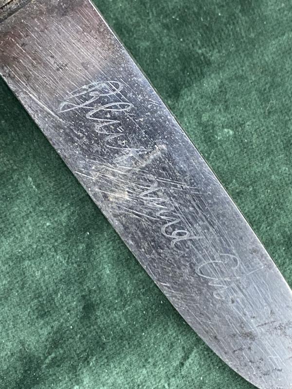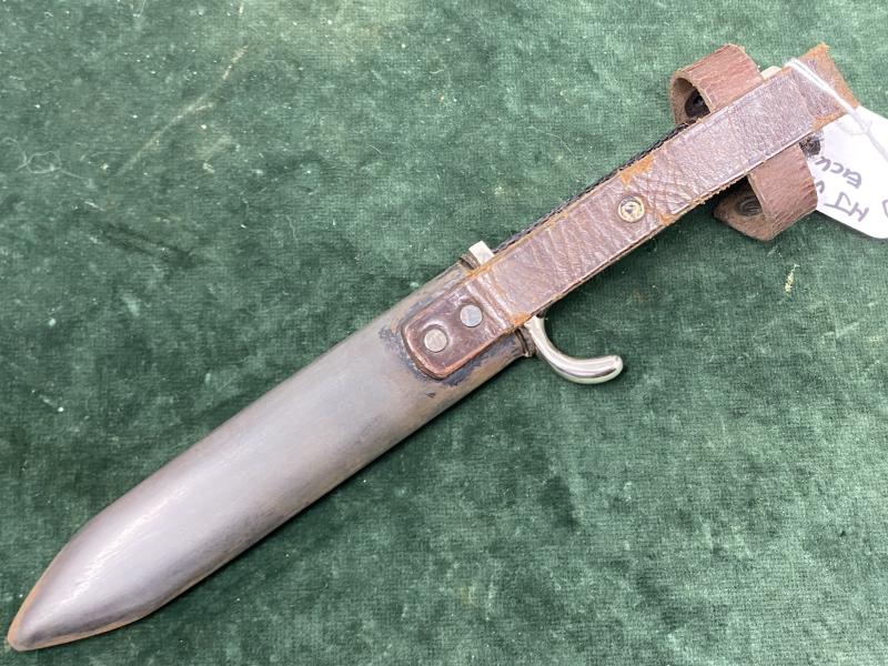 I have to admit in the 100’s of HJ knives I have handled, very early ones by Eickhorn do not appear! All steel hilt construction nickel plated. Chequered grip plates, which look to be ebony wood or Bakelite rather than celluloid, but I could be wrong. The blade has a full Blut und Ehre motto and NO blade riccasso, so thst really dates it. The Eickhorn trademark is one of their earliest from examples. A oval with a simple Eickhorn squirrel. Underneath Solingen and Ges.Gescutzt. Used from 1931-33!!! The very start of the HJ etc. Scabbard is straight with no damage. Has lost original black paint but retains the anodised finish underneath. Brown leather belt loop and cross strap with working popper. At some time, an attempt has been made to prise out the enamel HJ diamond and has chipped the grip plate around it. A really decent example right from the beginning.