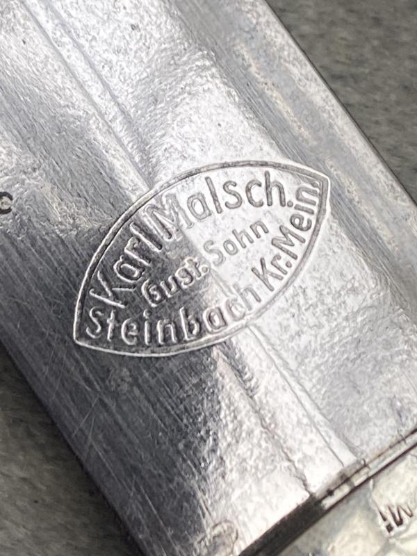 Here is a chance to acquire one of the rarer makers for early SA daggers. CARL MALSCH Steinbach Kr. Mein. Not even made in Solingen! This is rated as a 9/10 in the rarity scale and I certainly do not remember ever having one before. The exterior of the dagger is in near mint condition with uncleaned and undamaged solid nickel fittings. A superb wood grip. Perfect crossguards. Lower one with Mi Gau mark. Scabbard is not damaged and has a perfect lower ball. It retains all of the brown anodised surface and most of the original lacquer. There is a brown triple hanger attached to the upper scabbard ring. Hanger seems to be a later RZM marked piece but is complete and still worth £250 on its own!