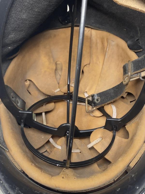 A near mint example of the lightweight aluminium helmet worn by the Third Reich Police fire service. Paint work is in near mint condition throughout. Helmet has both decals which are in mint condition. The Police badge on the left and the NS swastika shield on the right. The interior leather liner with leather pad go the crown, and chin strap are in perfect condition and the original black leather large neck shield is attached to the rear of the helmet with leather tabs. The helmet has holes in the crown for an aluminium ‘comb’ but this was not worn on all helmets, and there in no evidence of it ever being fitted (and therefore removed) on this one. A great looking helmet. Will display very well.