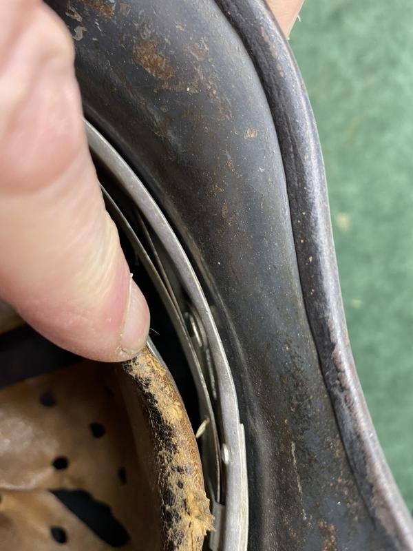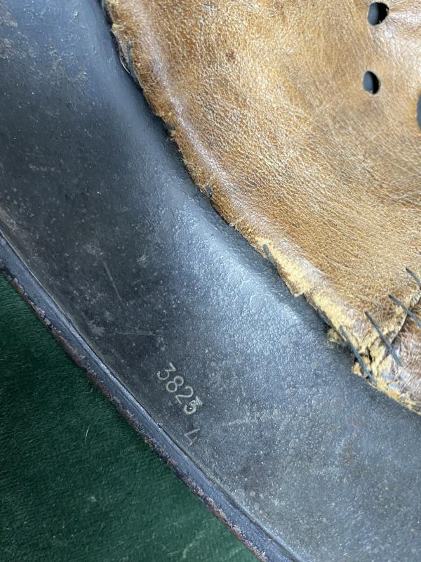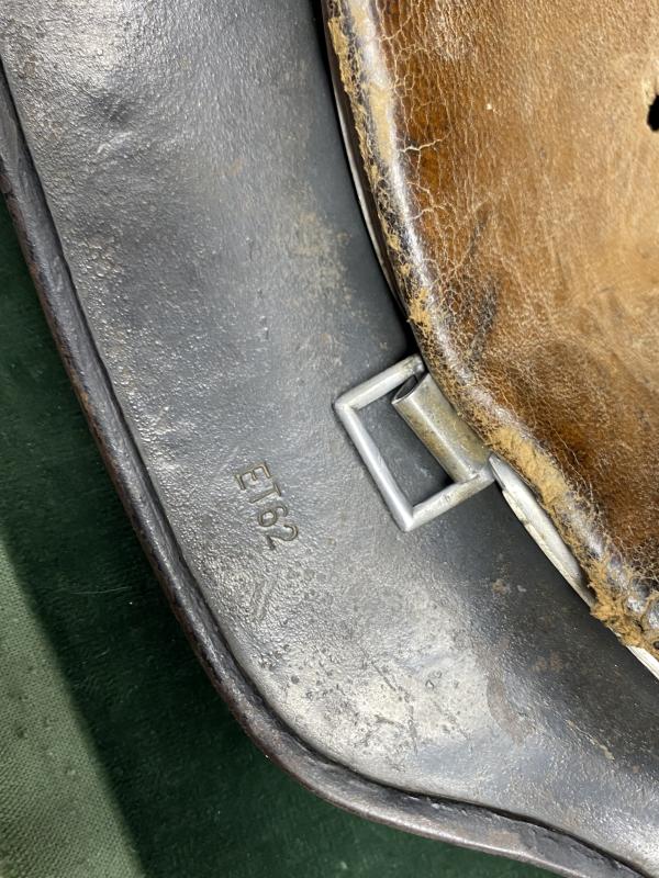I don’t often have helmets but as this was a part exchange deal, I was happy to take a few, all from an old collection. This is a very nice M35 double decal Luftwaffe steel helmet that has been left alone!! The M35 is a much harder helmet to find and is identified by the air vent rivets. M40’s were made with pressed out vents. Luftwaffe blue paint is remarkably intact and both decals are very clear and 90% complete. Nice, untouched liner shows honest wear. Neck of inside helmet is stamped with size ET62 and 3825. There is no chinstrap and no drawstring. Great looking helmet.