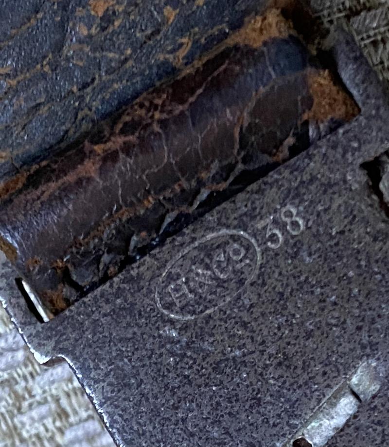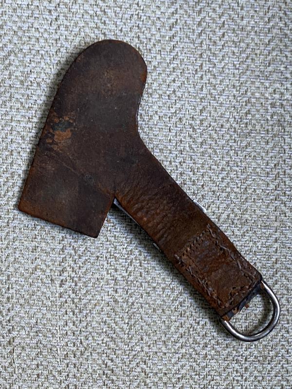A nice slight valuation on the standard hanger insomuch as the top clip has been replaced by a large D ring for use with a different belt loop/snap clip. All the original leather is the same with the bullet shaped protector that sits behind the dagger. The steel wide snap clip that actually connects to the dagger scabbard loop is marked to the rear in an oval, H&Co 38. (1938). Ideal to add to your RAD hewer.