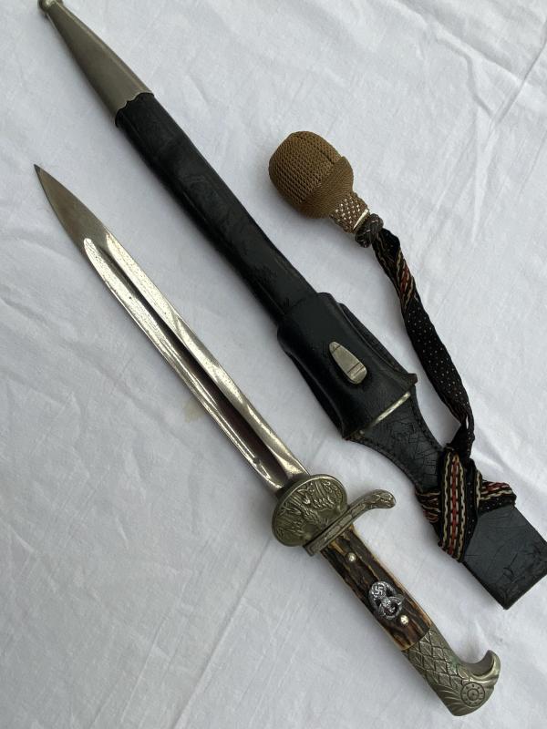 A rare example of the shorter Police bayonet from the early 1930’s with stag grips and clamshell. All heavy solid nickel fittings. Shorter bayonet and untouched. Aluminium police badge pinned to the grip. Black leather scabbard and frog. Has original cloth Police portapee tied to the frog. Nickel fittings pinned to the scabbard with staples. Short single edged blade with 1930’s Alcoso trademark stamped to reverse of riccasso. As I have mentioned many times before, police bayonets can be a complete collection on their own as there are SO many period variations.