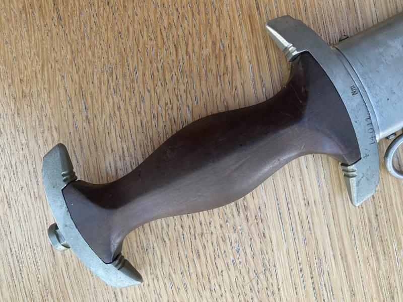 A very nice example of an early SA dagger, then changed to a NSKK, by rare (7/10)and unusual maker ROMUSO. This is the trade, shortened name for ROBERT MULLER & SOHN who were based in Merscheid-Solingen. An untouched and uncleaned dagger with great character. All solid nickel fittings throughout have a lovely toned patina. Dark wood grip is perfect with nickel eagle and perfect SA button. Lower crossguard has Nm Gau mark for Nordmark .