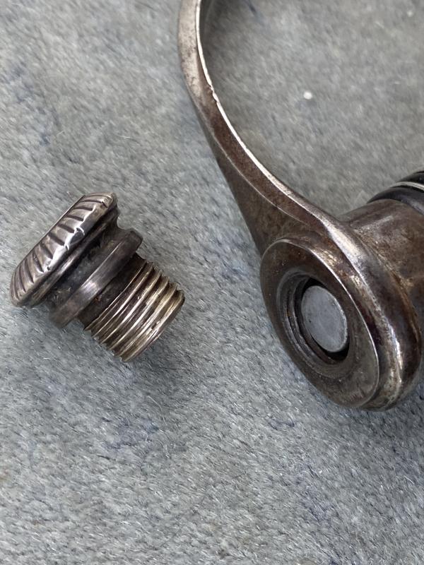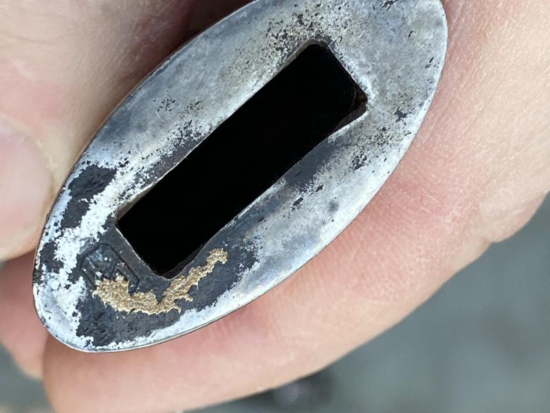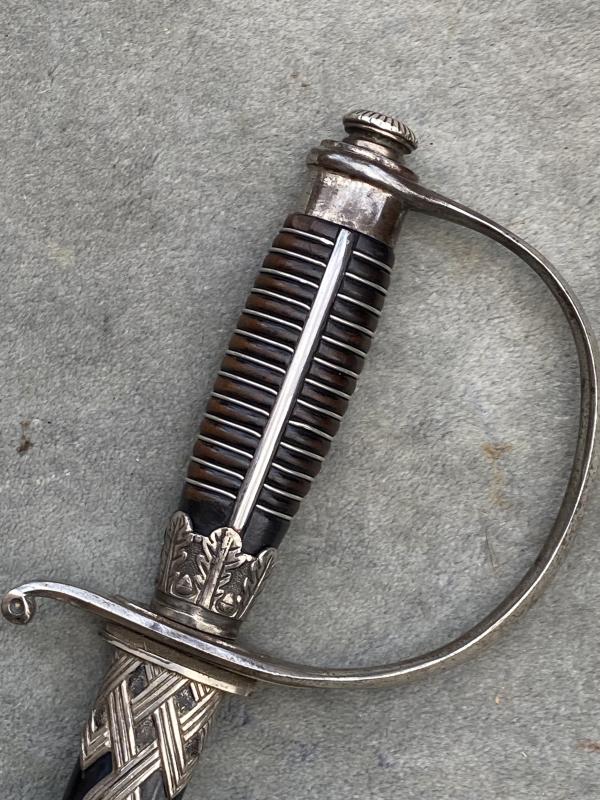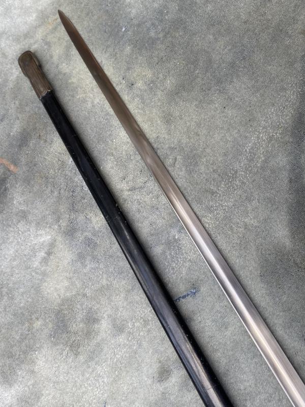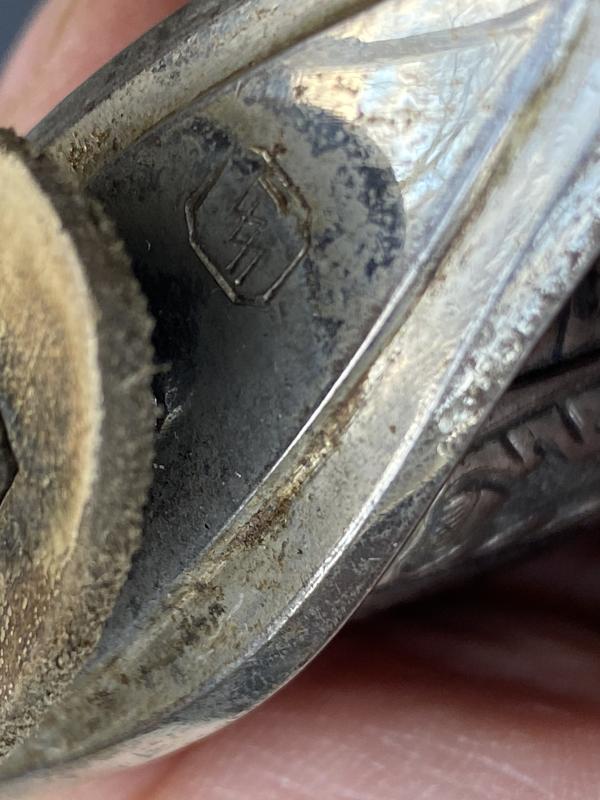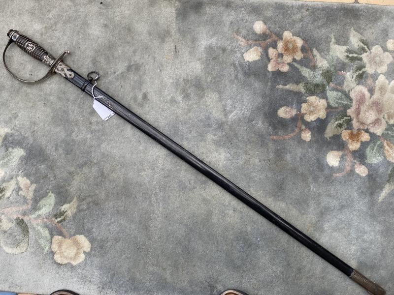 Always an impressive piece, and unlike the daggers, all SS officers dagens/swords were AWARDED and then presented. Not every officer was entitled to wear one. This is the much more ‘common’ slightly later version which had steel fittings which were nickel plated throughout. A nice D guard hilt which shows some slight wear and useage. Top pommel cap unscrews to show the tang nut cover intact etc. A very nice black ebony wood grip with the horizontal parallel nickel grip wire. The SS button is firmly fixed to the centre. There is a tiny chip in the grip on the reverse near the pommel. Very small. Scabbard has most of the original black paint intact and nickel plated steel fittings upper and lower. The scabbard throat as well as under the hilt crossguard are stamped with the little SS ‘ Kulturzeichen’ stamp. The mint blade is completely plain and devoid of any maker, which is VERY common on SS dagens, especially the later ones. The original white/cresm leather sword buffer is in place. The sword is quite long (never seen a short one!!) measuring 39 1/2 “ overall with a 33“ MINT blade.