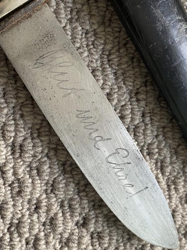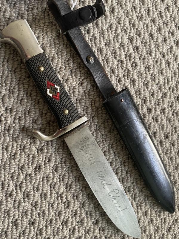 A nice example of a very early production HJ knife by TIGER. All steel hilt which is heavily nickel plated. No wear obvious. Black chequered grips with enamel HJ diamond inset into front grip plate. Original black painted scabbard with belt loop and cross strap. Leather slightly stiff but perfectly sound. Blade is an early type with NO riccasso. Blade buffer present. Nice, clear motto etched to the obverse blade. No damage or sharpening. Reverse has the TIGER logo running horizontally along the blade.