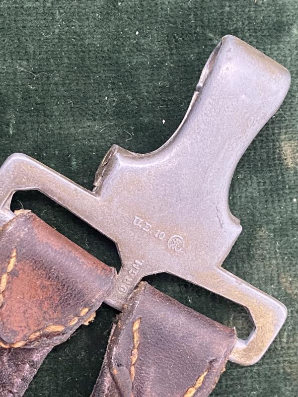 A very nice de-luxe set of used hangers for the Luftwaffe 2nd Pattn. dagger. This set has leather reinforced tabs to the tops, top clip marked with DRGM and RZM UE10. There is a great deal of the original gilt wash still present on the clips and buckles. Straps are in good condition. Velvet backings show just a little honest wear. No damage.