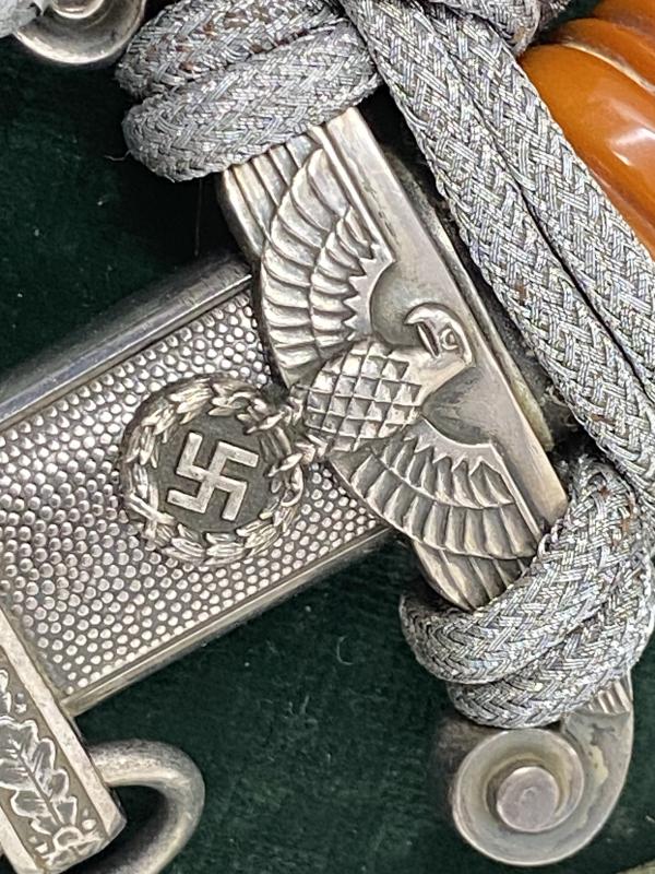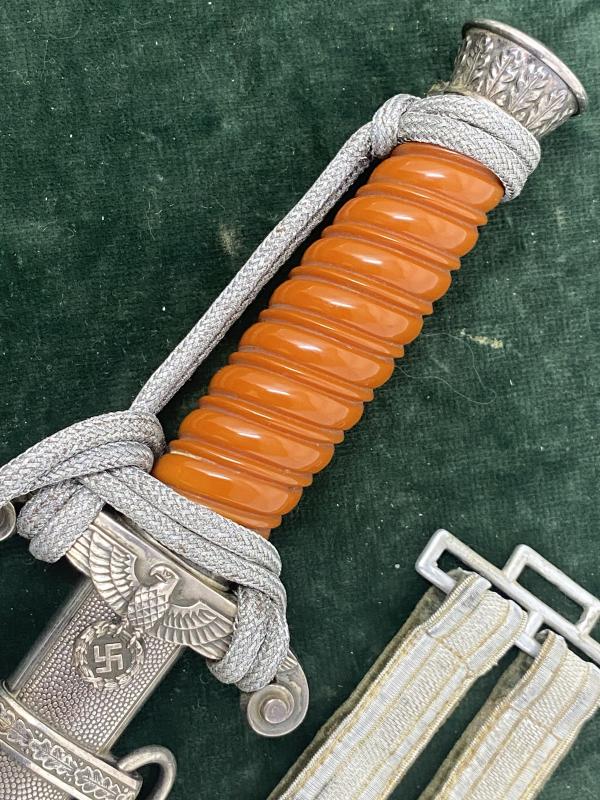 This is one of the best army daggers I’ve had in quite a while. Ok, so Eickhorn army daggers are still relatively common but this one is also complete and the condition is second to none! Beautiful deep pumpkin orange solid celluloid grip. Original 42cm bullion portapee in STONE MINT CONDITION. All the metal fittings everywhere have perfect heavily silvered fittings. Not one spot of lifting or bubbling anywhere! Scabbard is faultless!!! Can’t say any more. Blade has the 1935/41 Eickhorn etched squirrel. There is 100% original crossgrain to the blade surface. STONE MINT BLADE. The hangers are equally in mint condition, with no signs of ever being worn!! Perfect bullion fronts and perfect green velvet backing.