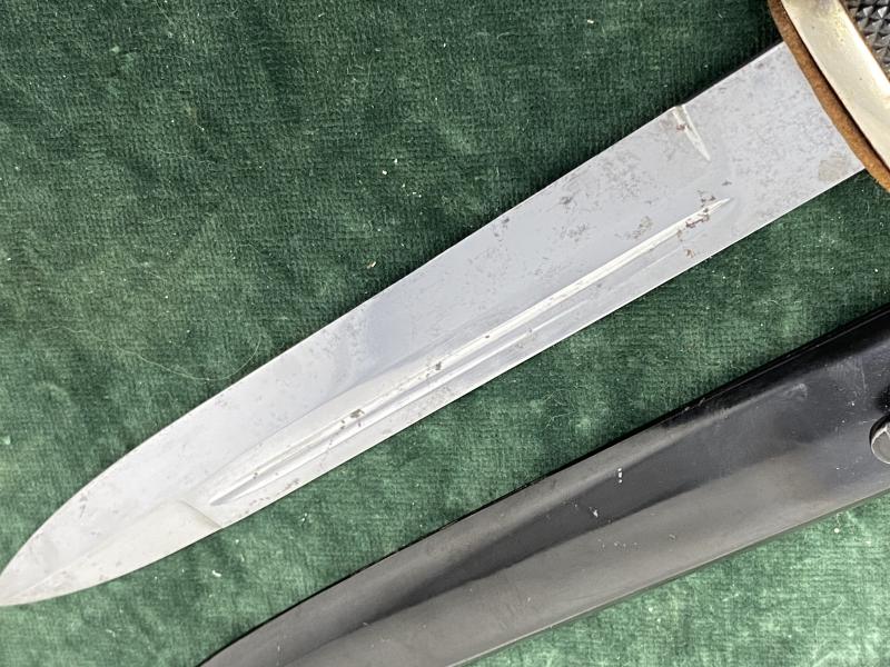 A recent purchase from America, this is a mint example of this type of unusual dress bayonet. I’m not sure how these have been labelled ‘pioneer’ bayonets, as there is no period reference to them being called this at all! They are pictured in the Eickhorn and WKC period catalogues but just have production numbers etc. No name. All of them feature the crossgusrd WITHOUT the upswept quillion. This was just a new design tried out by these companies, but it did not prove very popular so hence they are quite rare to find. This one has 100% of the ORIGINAL nickel plated hilt etc. Perfect chequered crossguards and mint untouched black painted scabbard. The nickel plated carbine type blade, with false edge, is in very good condition. A couple of old finger smudges. No damage, no sharpening.