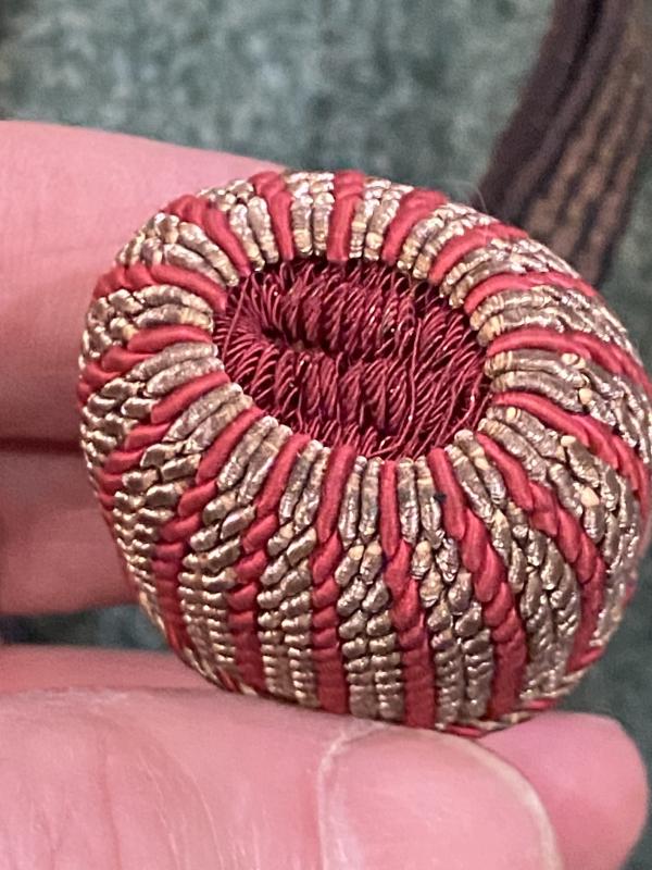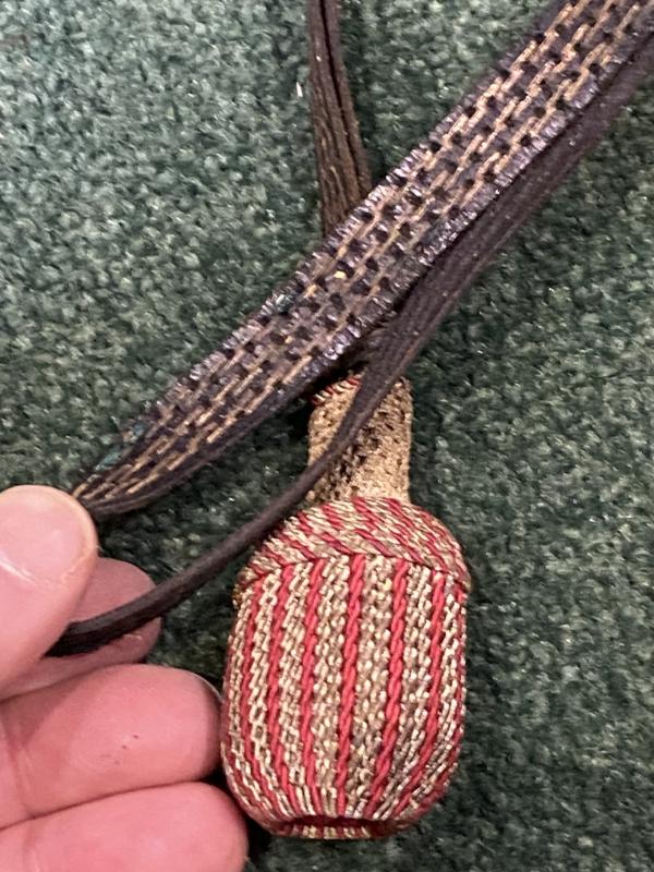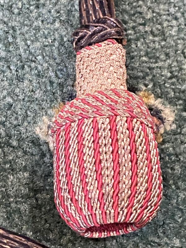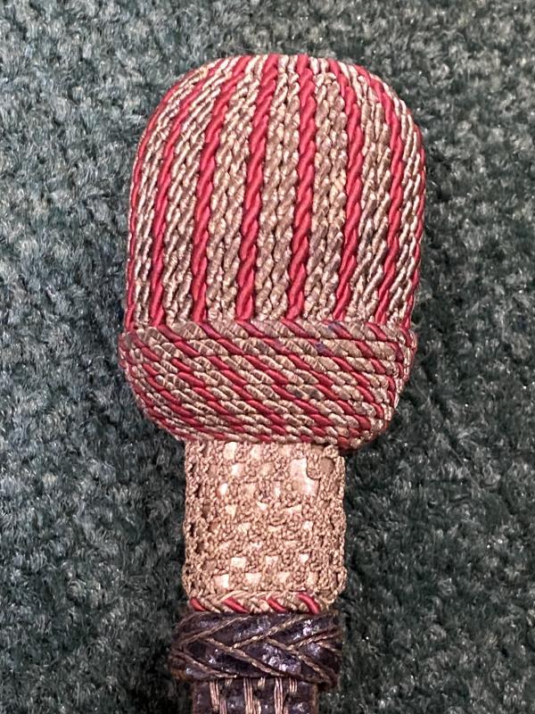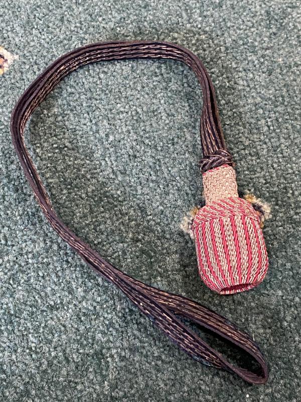 This seems to have been tied to a bayonet and removed. In very nice condition, it has all aged to a nice patina. Black leather strap with triple silver wires. These have become a ‘golden’ colour with age. Leather very supple. The bullion acorn ball has the usual alternation red/silver threads, which have also gained some age patina. The bottom of the acorn has a bright pink/red stuffing. Complete your fire bayonet with the correct original knot.