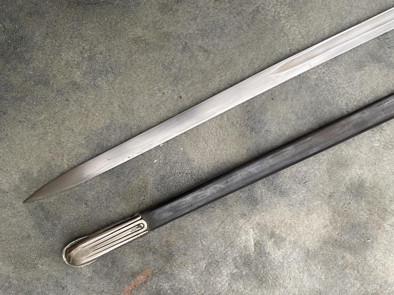 These were legitimate parade swords that could be purchased by the Officers themselves and worn accordingly. The actual SS OFFICER DEGEN. was presented only, you could not go and buy one yourself. These candidates swords are virtually identical the the SS degens but do not have the large SS button inset into the grip. They are also constructed in a different way, insomuch as they are made like police officers swords and the top pommel unscrews which holds all the grip and hilt onto the blade tang. SS degens are not like this. Sword is in very nice overall condition. Nickel plated steel hilt. Black ebony wood grip with single vertical wire wrap. Unusually this individual has had a nice enamel SS runes button professionally inset into the pommel cap. Lovely work. Scabbard is anodised/blued instead of being painted. Upper and lower fittings are attached by headless screws. There is a white leather blade buffer. The blade is very nice indeed and has the Eickhorn 1935/42 squirrel deeply stamped into the riccasso.